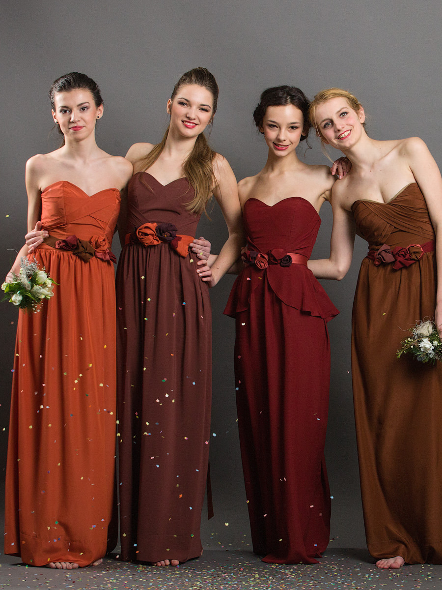 Hangulatos összképet alkotnak a föld- színekben pompázó ruhák, melyek a rusztikus esküvők tökéletes kiegészítői lehetnek. Hat darab, fűzővel alakítható modellt ajánlunk, a pánt nélküli felsőket vállpánttal is kiegészítjük.