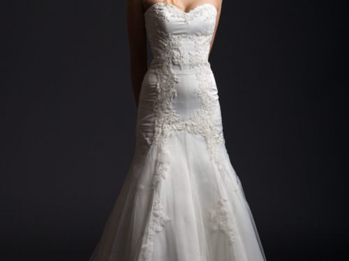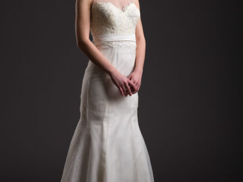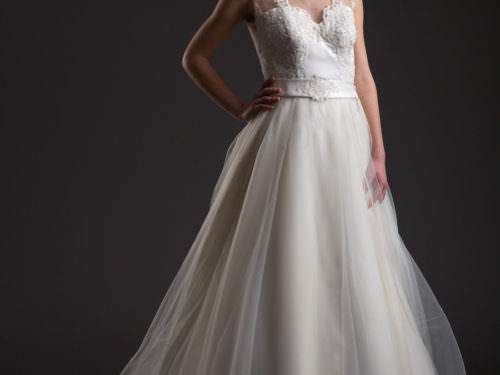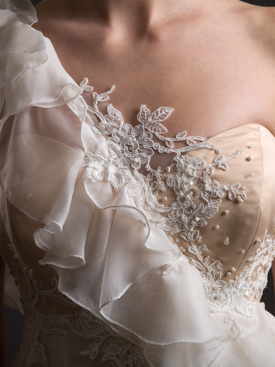 Laza esésű, több muszlinrétegből álló ruha, mely tánc közben csodásan repül. Nude korszettjének köszönhetően a legújabb trendeket idézi, asszimetrikus vállrésze finom fodrai pedig szintén modern hangulatot árasztanak. Finom csipkevirágok és apró gyöngyhímzés gazdagítja.