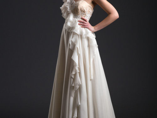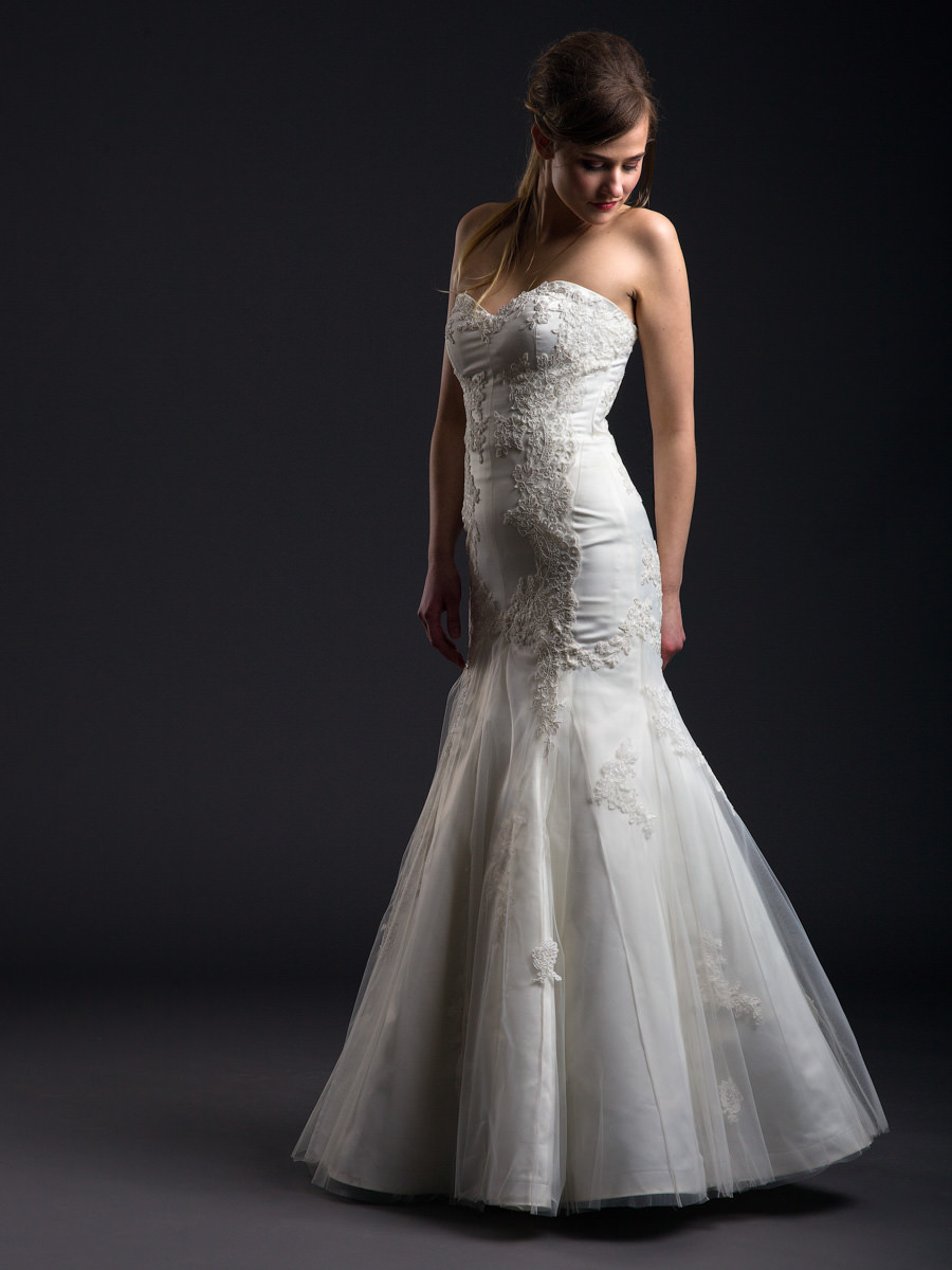 Sellő szabású ruha, szoknyáján finom tüllel. A kúszó csipkeminta látványosan körbefonja a dekoltázst és leszalad a szoknyára, így hangsúlyozza a nőies formákat. Csipkéből kialakított vállpánttal is viselhető.
