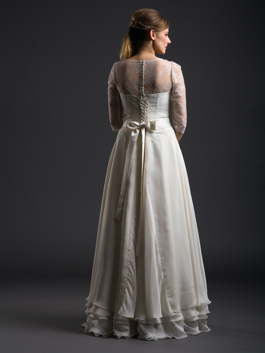 Visszafogott vonalvezetés és diszkrét anyaghasználat jellemzi ezt a lágy esésű muszlinruhát, melyet a klasszikus francia csipke még kifinomultabbá varázsol. Az áttetsző csipke- ujj nagyon jellemző a legújabb menyasszonyi ruha trendekre.