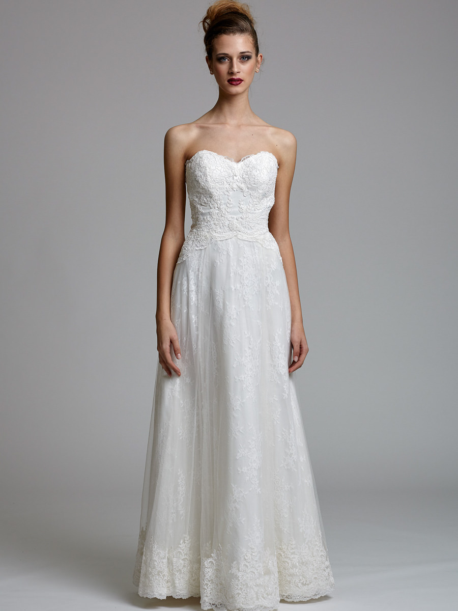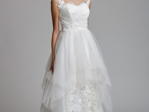 Csipkék mesés játéka érvényesül ezen a ruhán. A hosszított korszett finom hangsúlyt ad a csípőnek, a zsinórozott, szimmetrikus csipkemotívumok alól finoman bújik elő a tüllel kombinált könnyű csipkeszoknya.