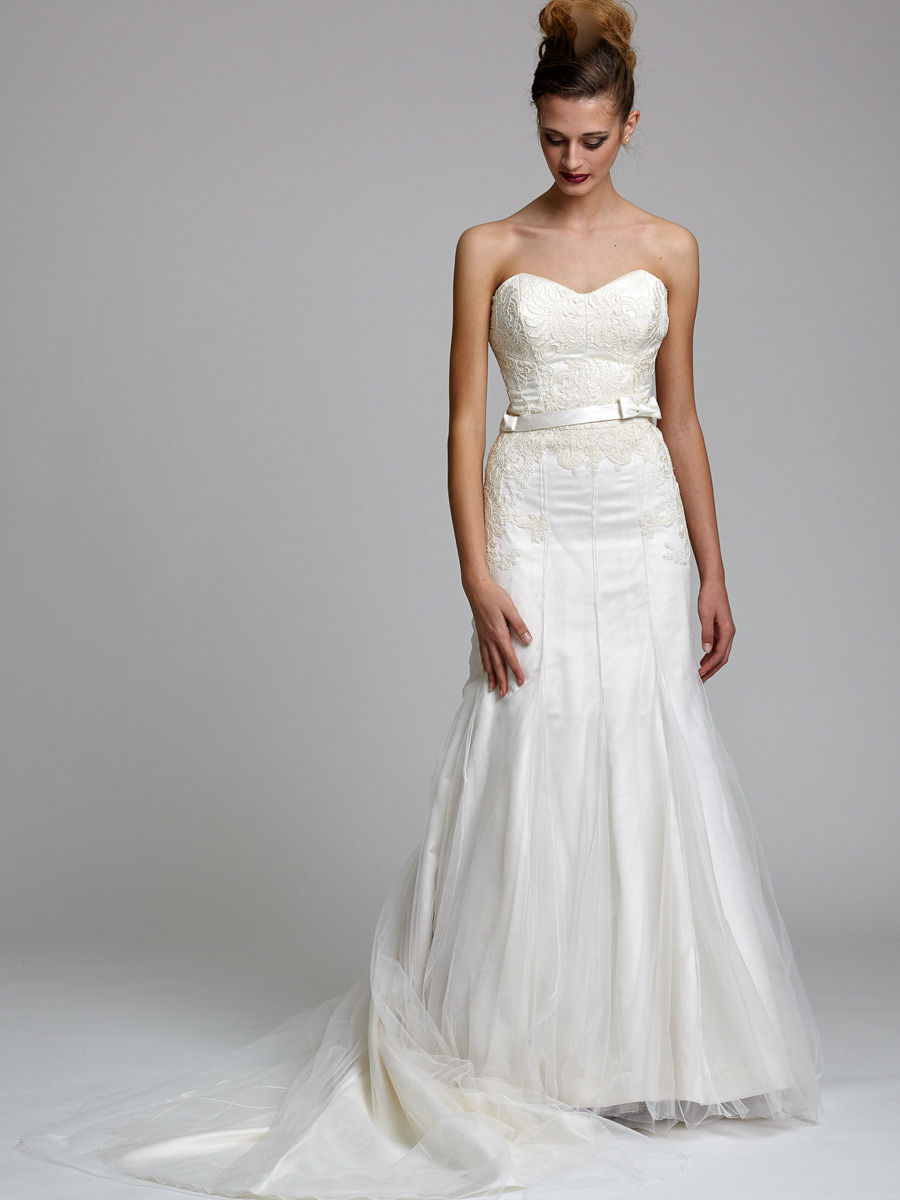 Klasszikus és elegáns. A sellő szabásvonal hangsúlyozza az alakot, ugyanakkor szépen vezeti a tekintet. A korszett geometrikus szabásvonalait lágyítják a organikus csipke motívumok, a könnyű tüllrétegek pedig mintha csak lebegnének viselője körül. A legombolható uszály elegáns kiegészítője a ruhának.