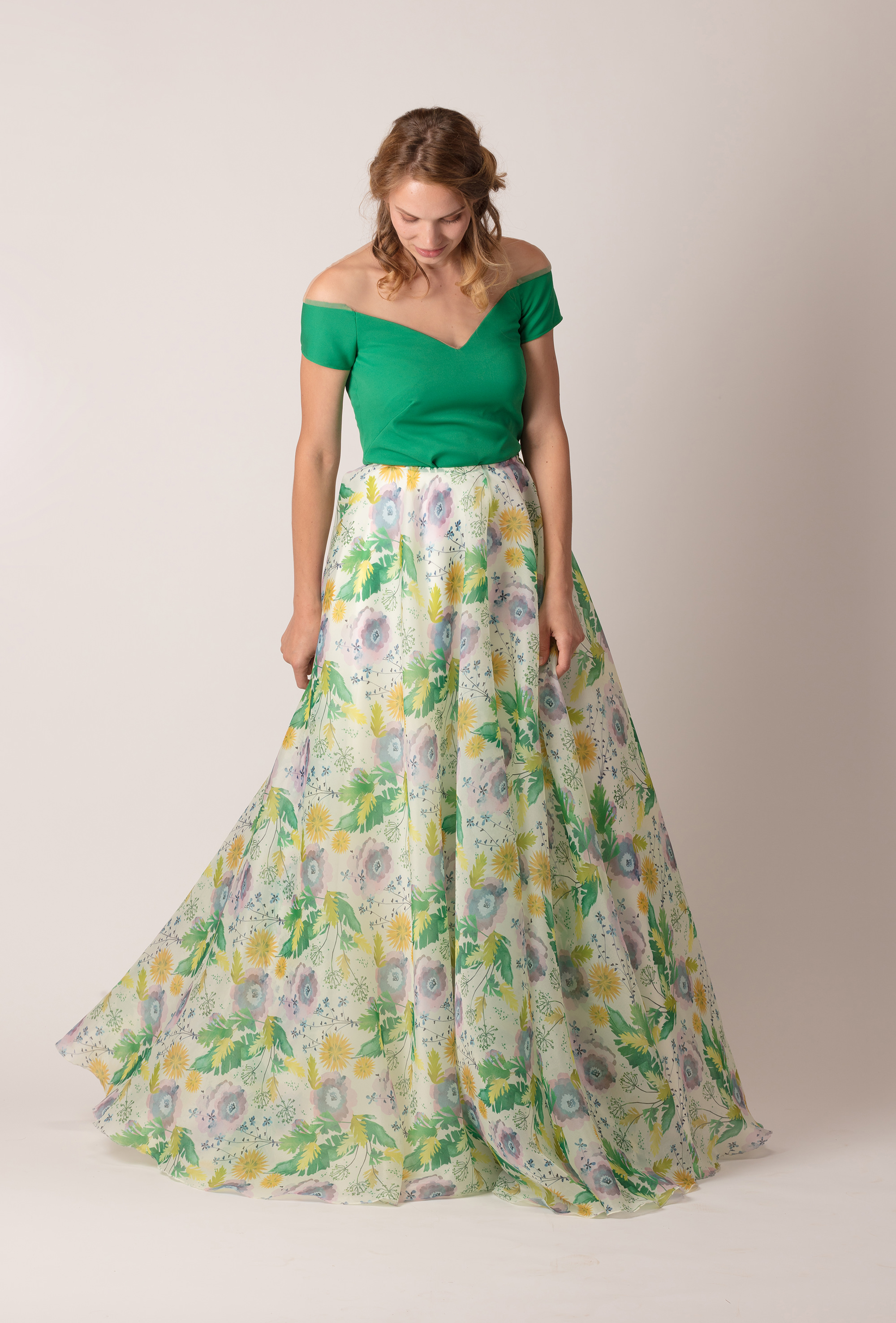 Această bluză elegantă simplă din georgette creponat este combinată cu tul transparent, iar datorită acestui material decolteul și umerii devin vizibili. Simplitatea croielii este întreruptă de șirul de nasturi de pe spatele bluzei.