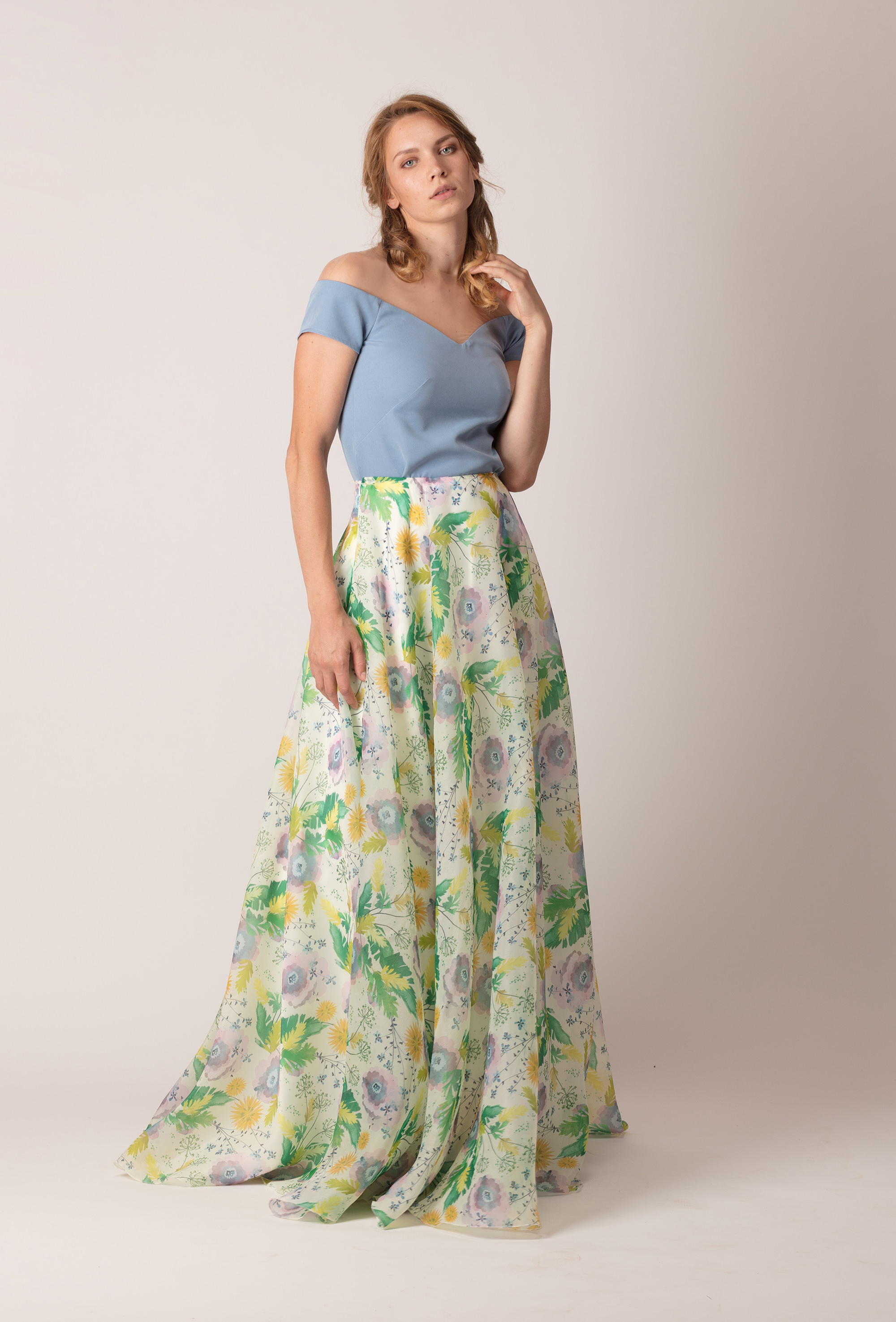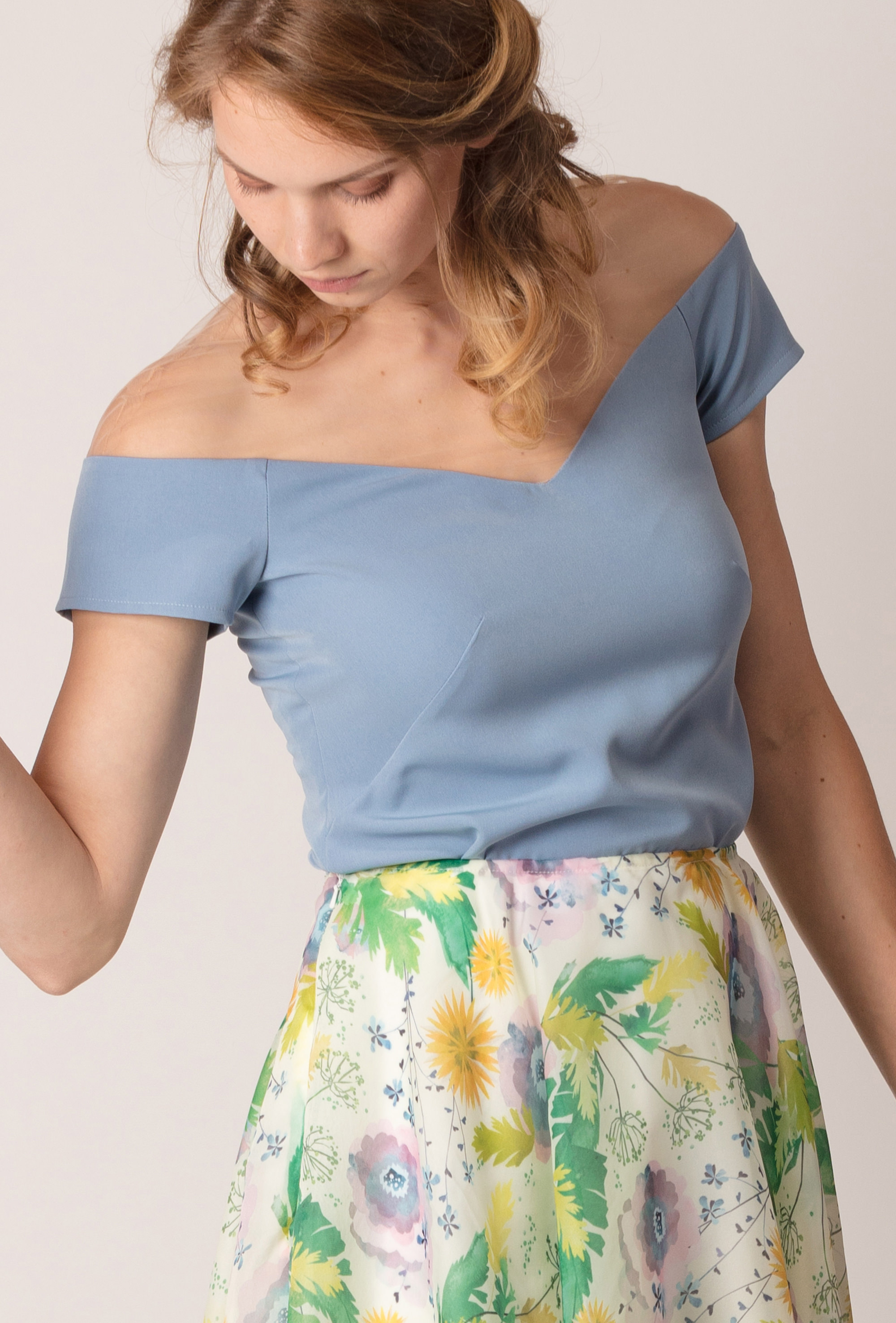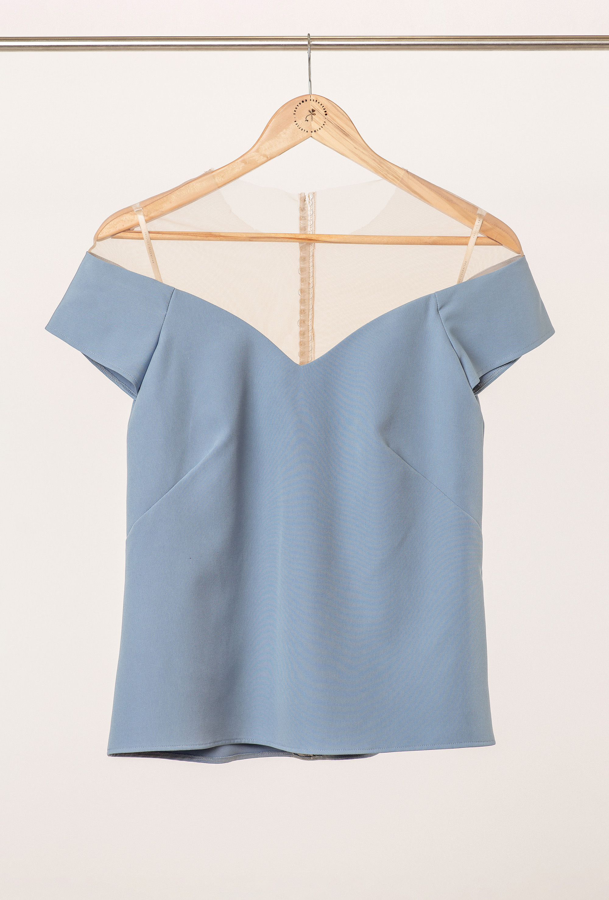 Această bluză elegantă simplă din georgette creponat este combinată cu tul transparent, iar datorită acestui material decolteul și umerii devin vizibili. Simplitatea croielii este întreruptă de șirul de nasturi de pe spatele bluzei.