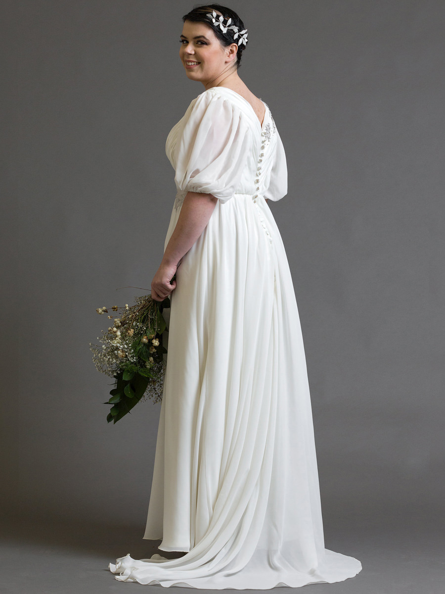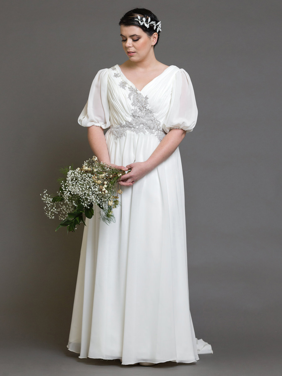 Kényelmes, laza esésű ruha, háromnegyedes ujjal. Különlegessége a homokszínű csipkének köszönhető, mely a dekoltázst és a derékvonalat díszíti. Rövid uszálya felgombolható, így a klasszikus stílusok kedvelőinek és a táncoslábúaknak egyaránt ajánljuk.