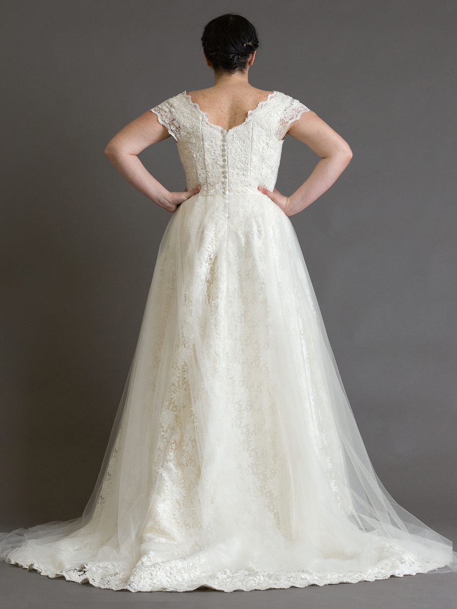 Klasszikus szabású, mégis igazán trendi ruha selyemfényű makramé típusú csipkéből. Kombinálható modell, mely derékra illeszthető tüllszoknyával viselhető, de önmagában is tökéletesen megállja a helyét. Uszálya felgombolható.