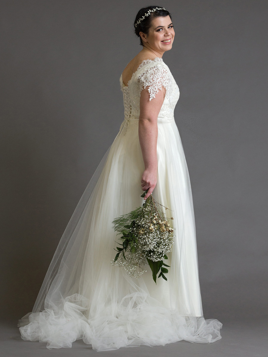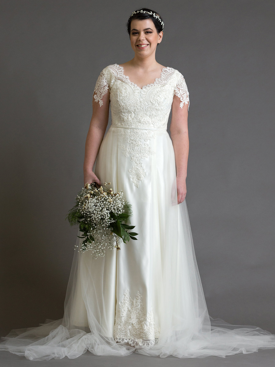 A finom csipkével boritott váll és dekoltázs hívja magára a figyelmet ennek a ruhának az esetében. Igazán előnyös lehet a teltkarcsú hölgyek számára, hiszen díszítése a vertikális vonalakat hangsúlyozza. Különálló tüllszoknya teszi trendivé, mely a bulira könnyedén levehető.