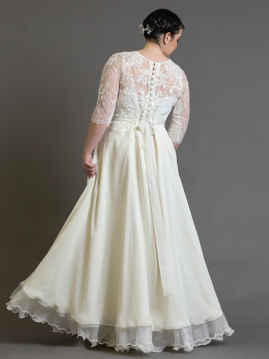 Lágy anyagok és diszkrét francia csipke párosa teszi elegánsá és könnyen viselhetővé ezt a diszkrét muszlinruhát. Fűzős megoldásának köszönhetően igazán csinos derekat varázsolhatunk vele, mégsem kell lemondanunk az apró gombok jelenlétéről.