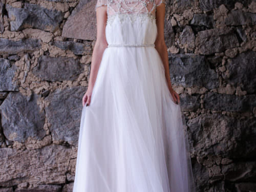 „La modă” şi „lejeră”, sunt cele două expresii, care caracterizează acestă rochie din două piese. Între ridurile fustei bogate şi dominante se ascund buzunare îndrăzneţe, iar topul delicat din dantelă creează un ansamblu cu adevărat boem. Trena se poate prinde cu nasturi. Recomandăm mireselor îndrăzneţe. În salonul nostru poţi alege dintre mai multe rochii din două piese de agest gen.