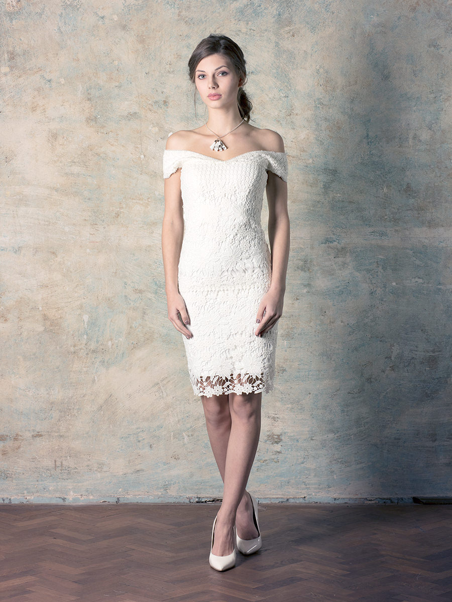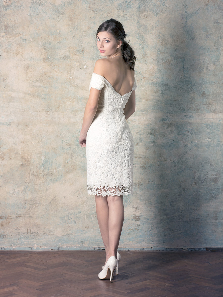 Eleganța, linia feminină sunt caracteristicile acestei rochii de mireasă scurtă din dantelă.