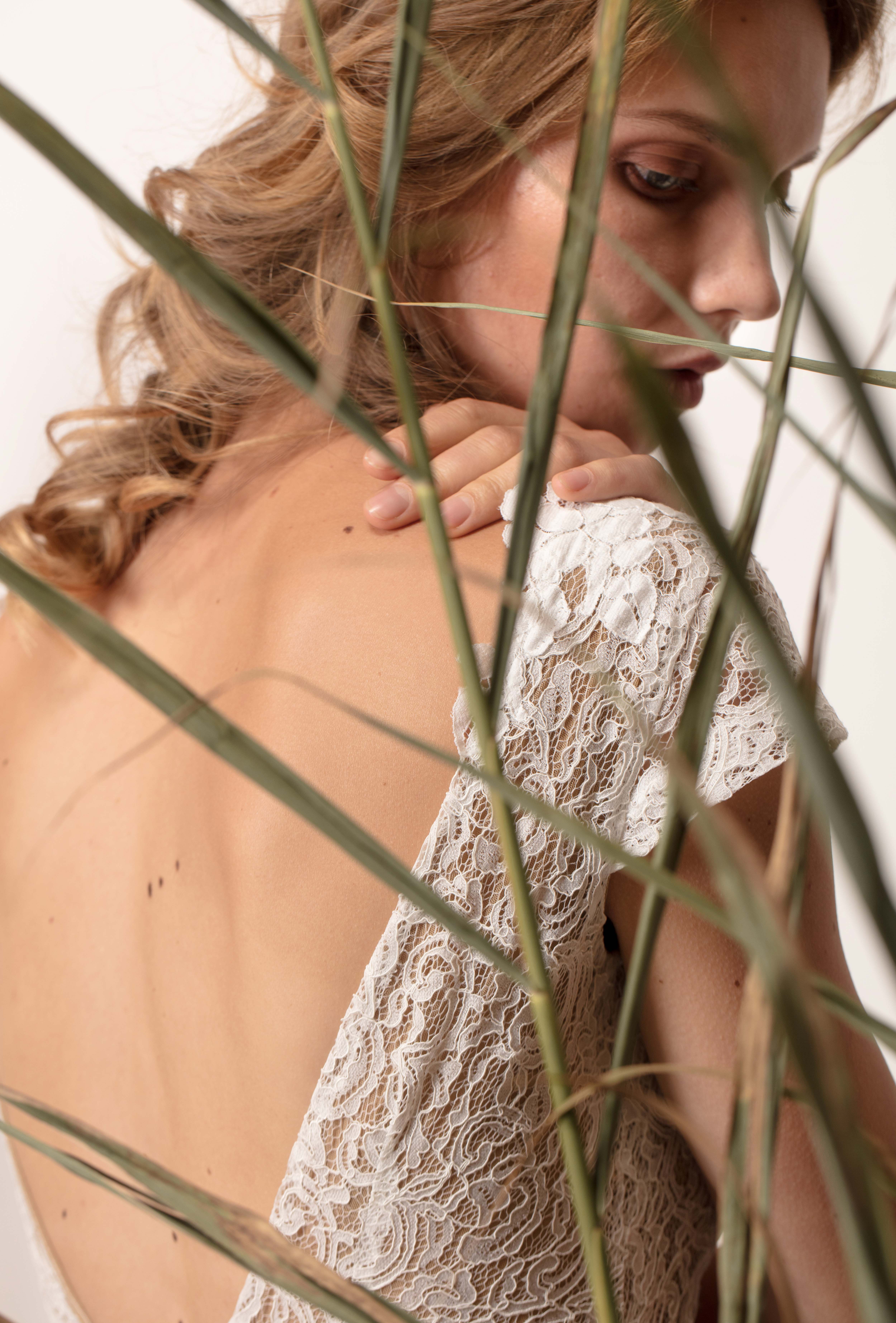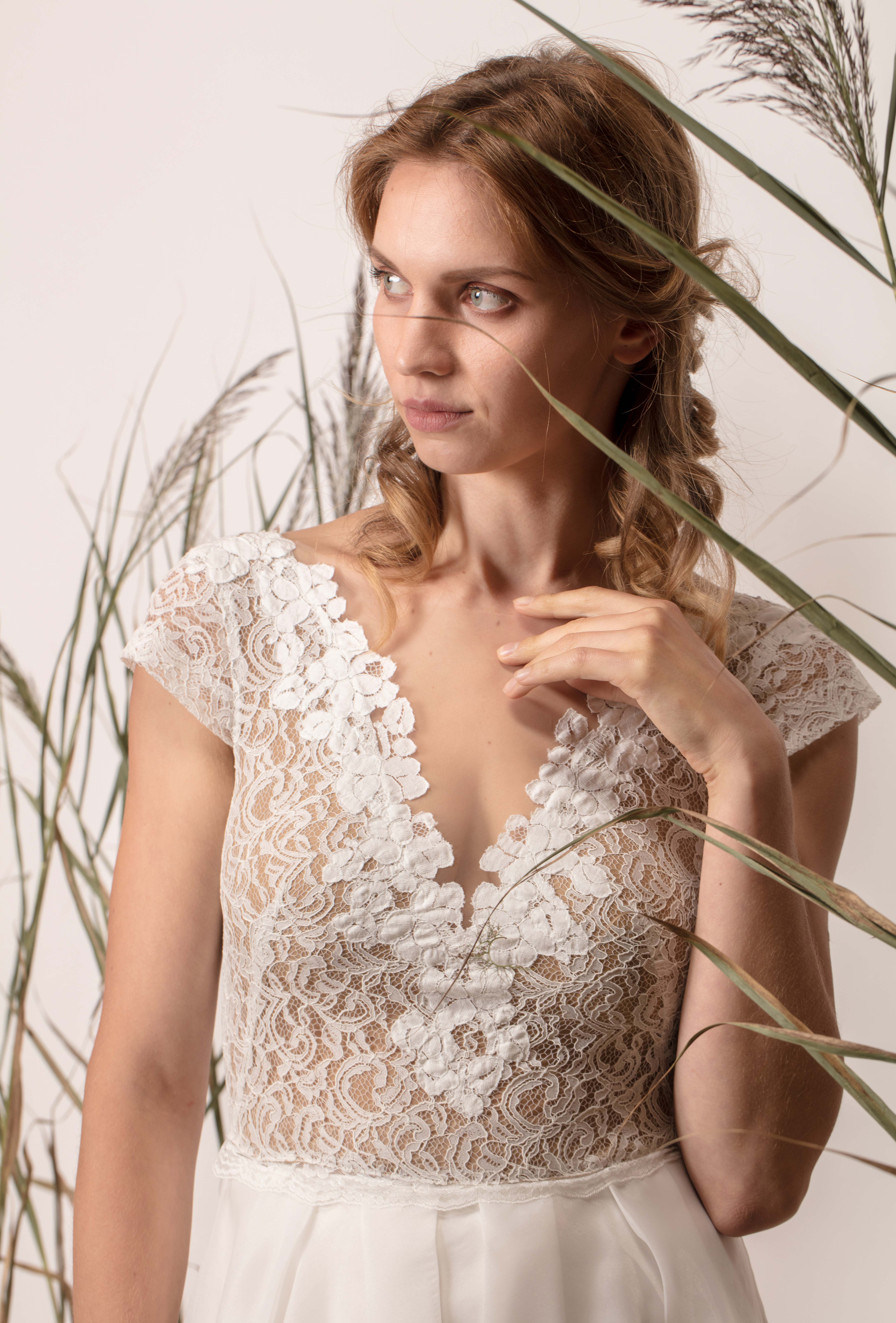 Visszafogott egyszerűség nőies részletekkel: a finoman szegélyezett nyakkivágás, a bátor hát és a leheletkönnyű francia csipke teszi egyedivé ezt a felsőt. A csipkefelső a nude színű anyagduplázásnak és a belevarrt melltartószivacsnak köszönhetően nem átlátszó. Könnyed esésű A-vonalú organzaszoknyával társítottuk a még elegánsabb összhatásért. Ezt a felsőt kérheted zártabb hátkivágással is.