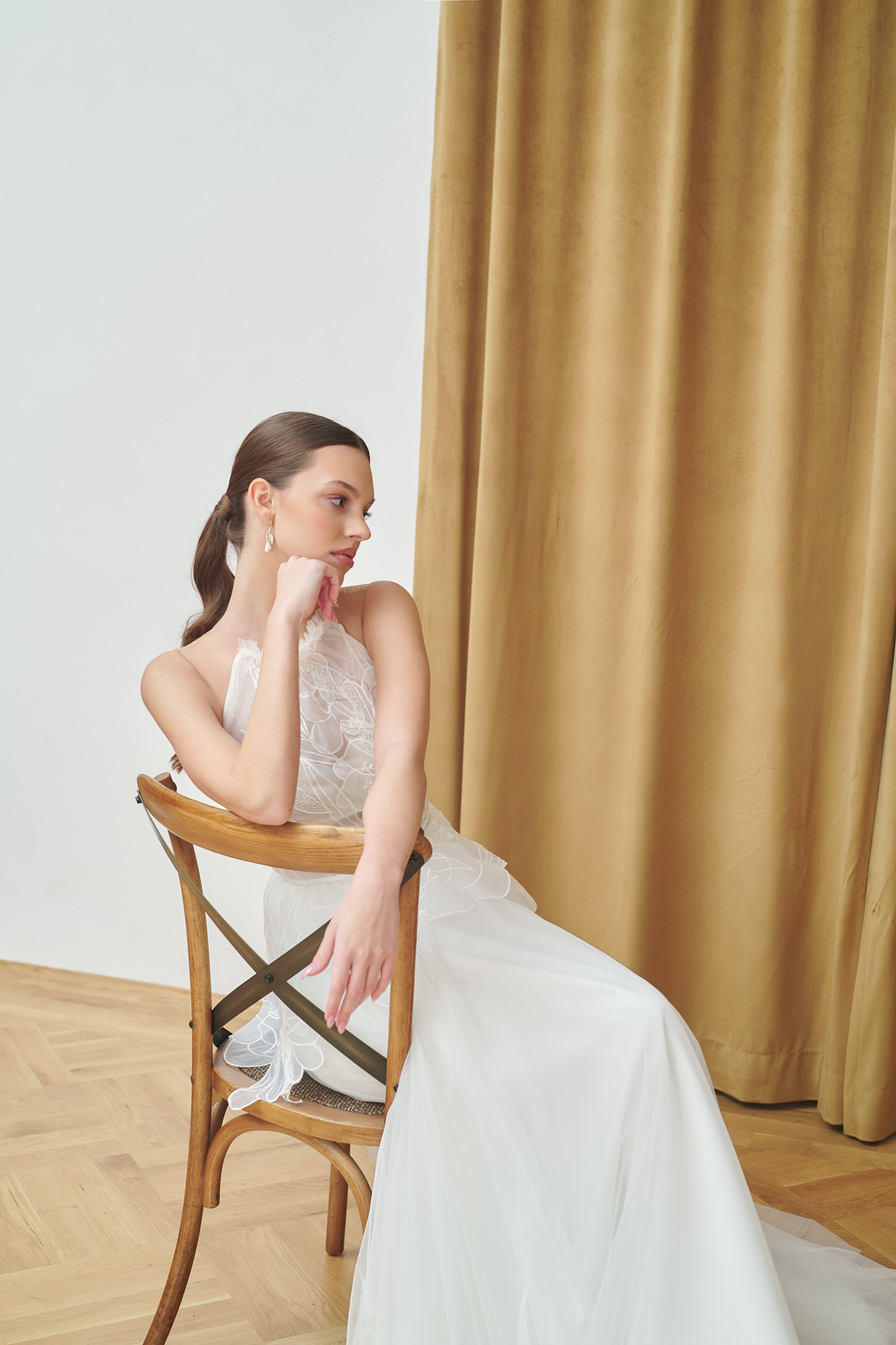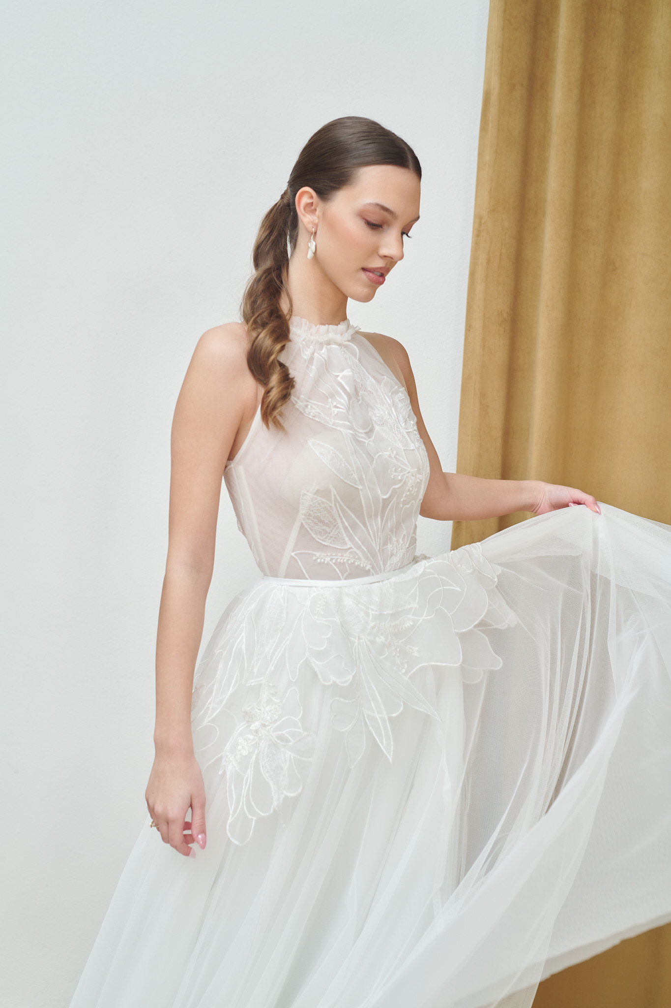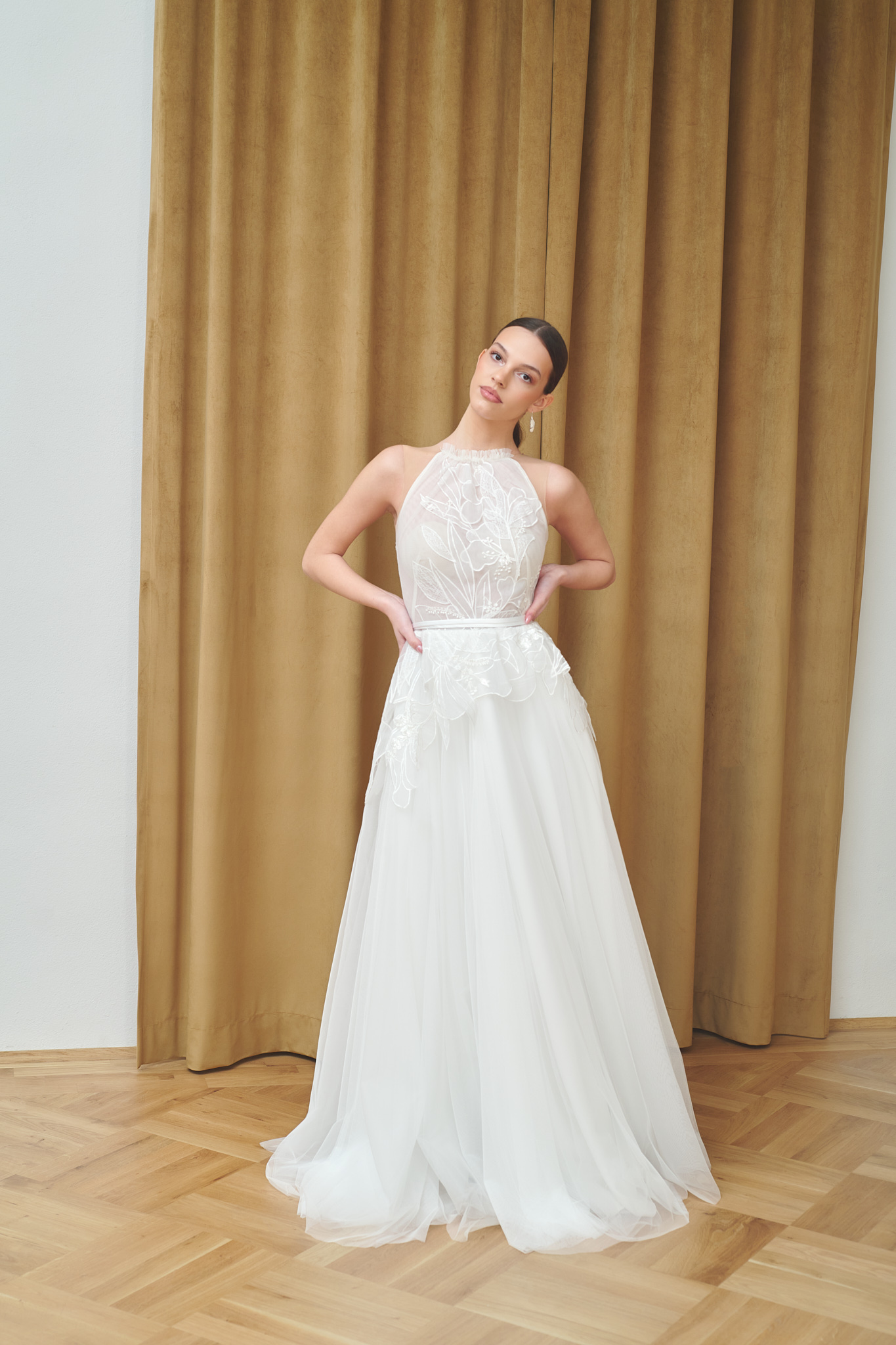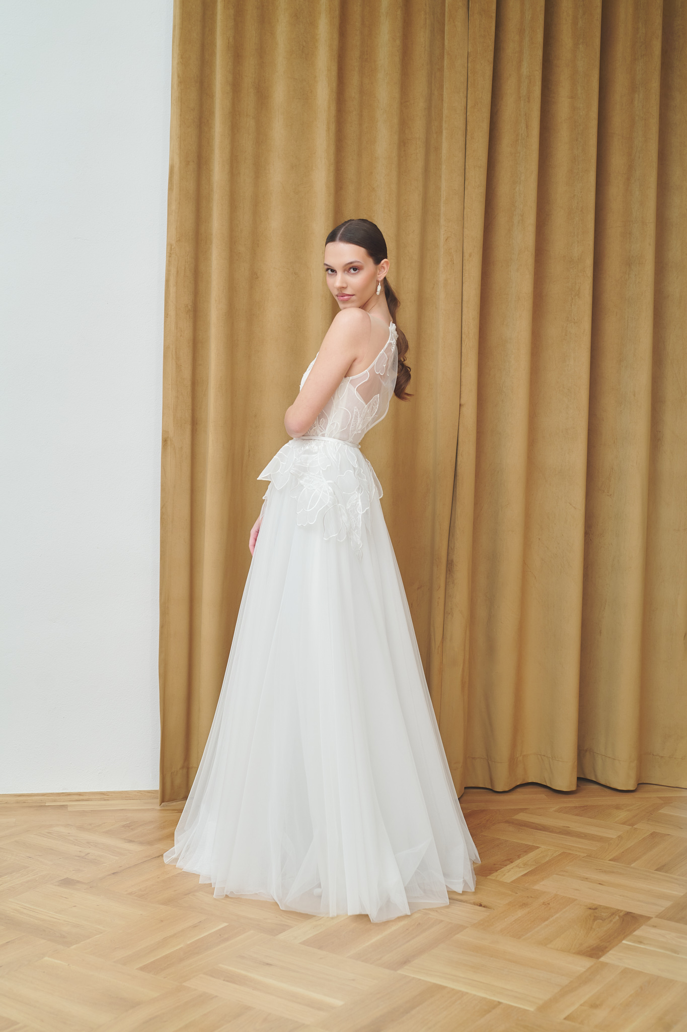 Kortárs mégis romantikus ez a bohó stílusú hercegnős tüllruha. Aprólékos kidolgozás jellemzi a felsőt, gyöngyök és csipkevirágok díszítik, pici fodor szegélyezi a nyakát. A modern Hamupipőkéknek alkottuk.