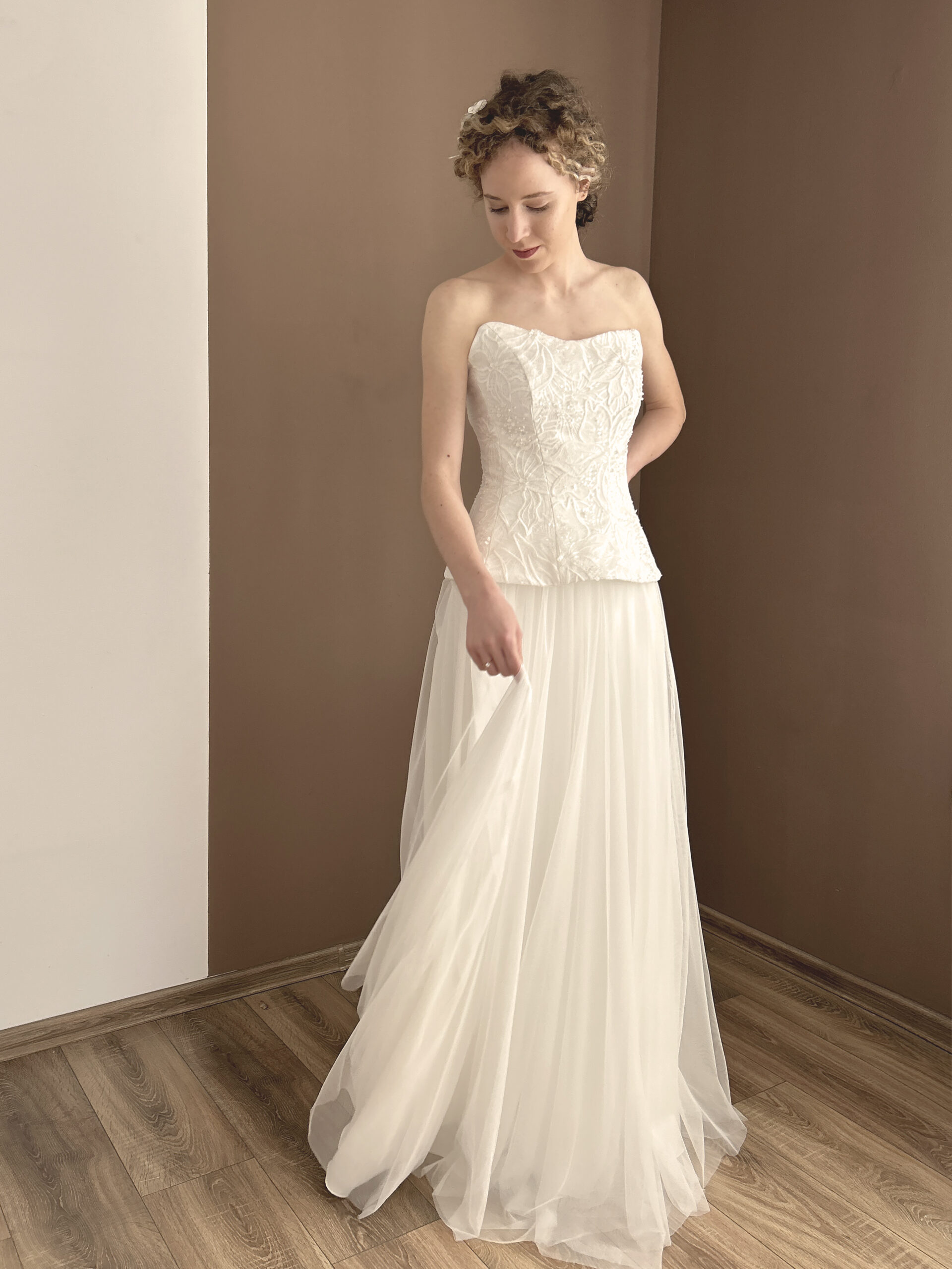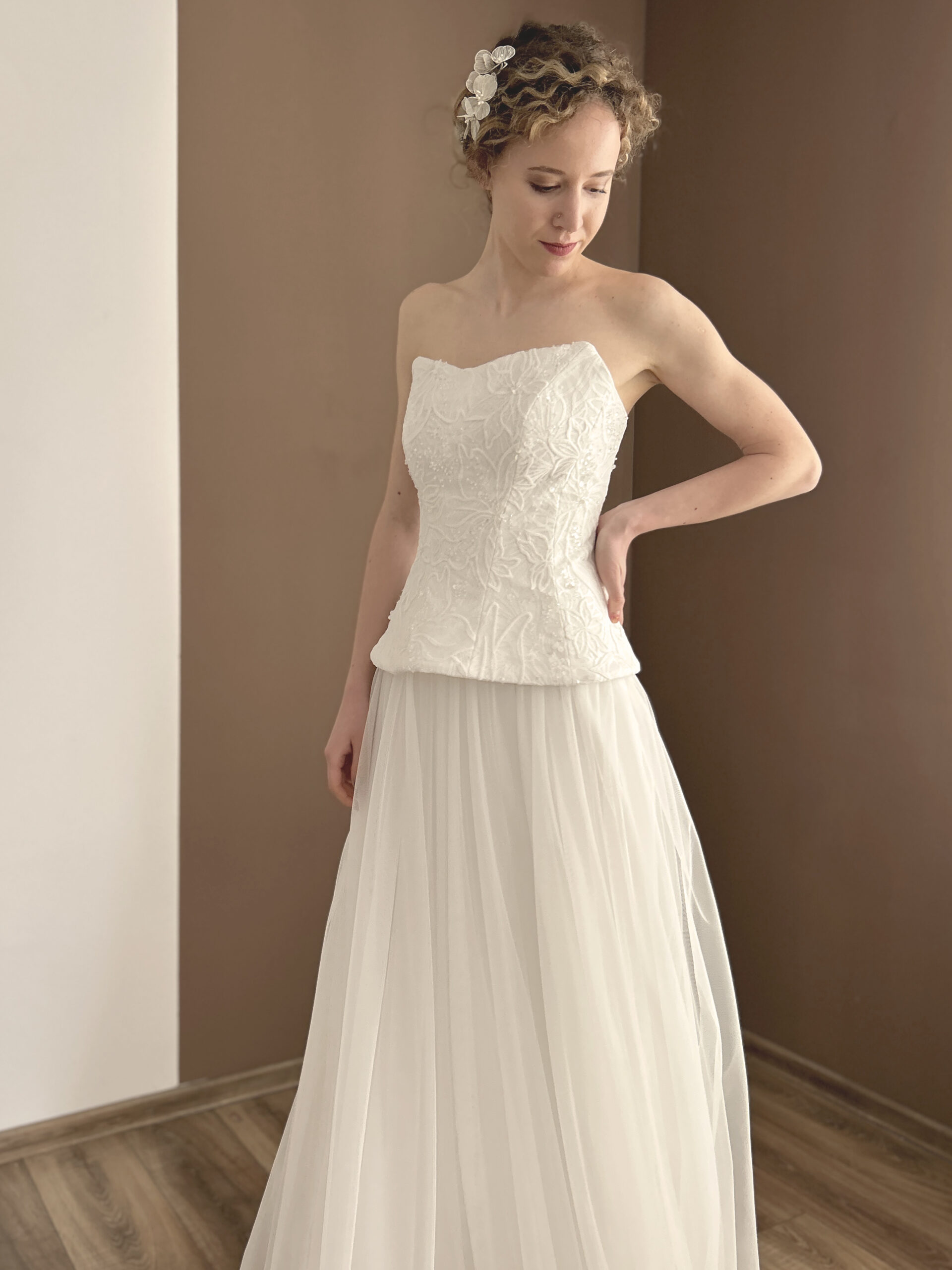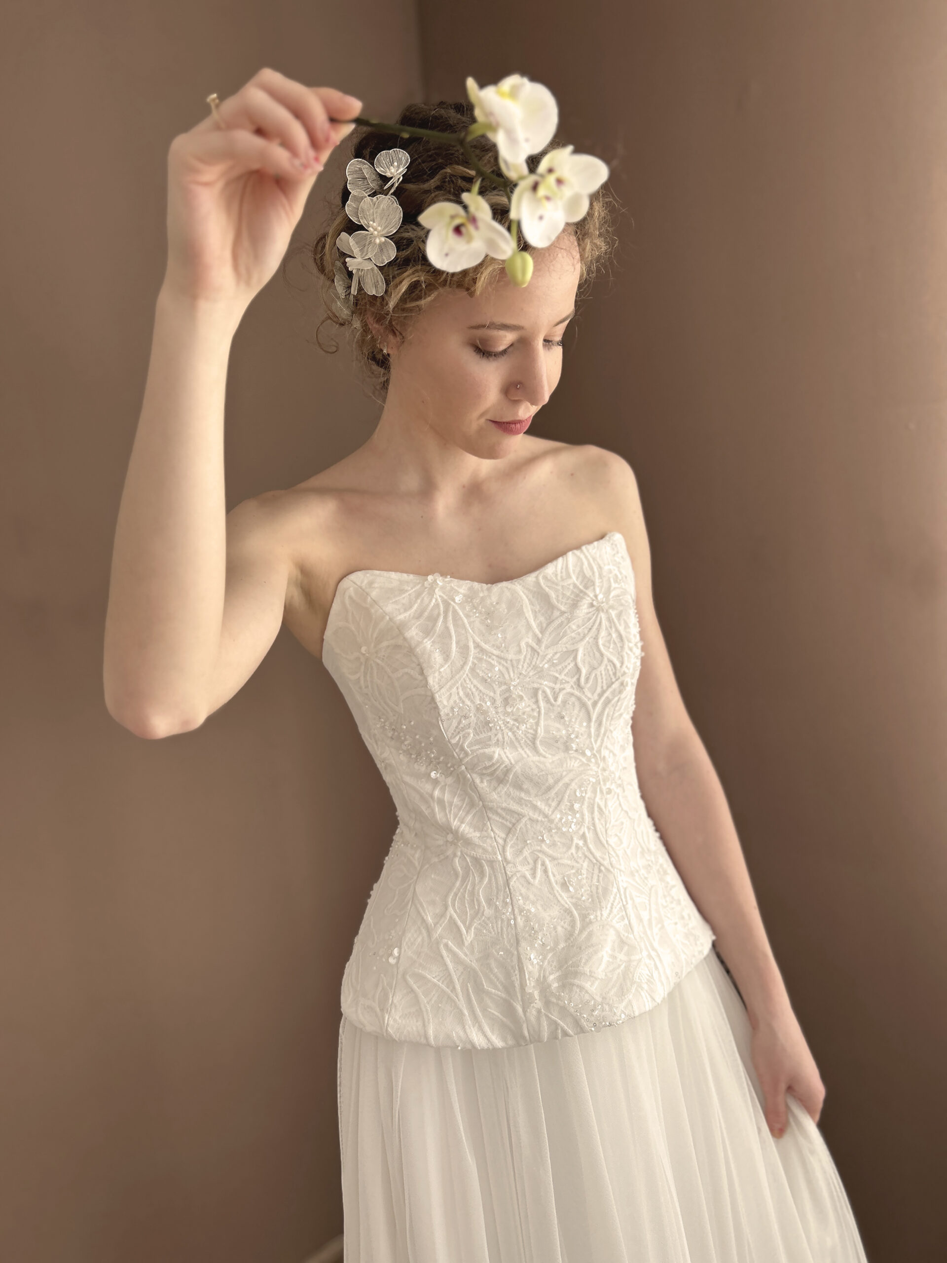The corset—a cornerstone of contemporary bridal fashion—takes center stage in the Delikates collection. For this design, we emphasized the hips and adorned it with intricate pearl and sequin embellishments. We recommend pairing it with a soft tulle skirt, though it can be effortlessly styled with any of our skirt designs.