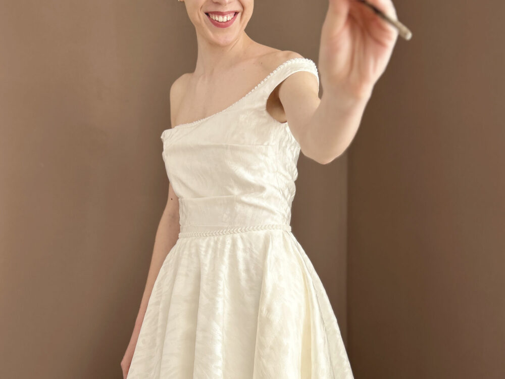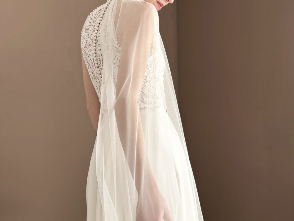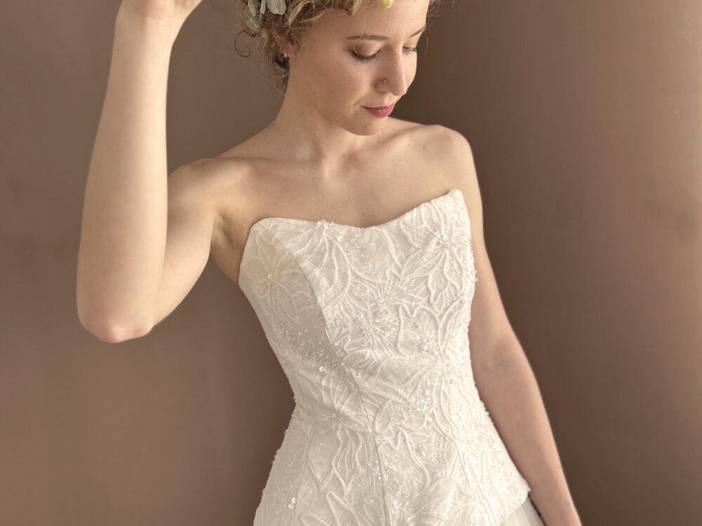 A modern bride’s dream—this minimalist gown is designed for those who seek refined textures and contemporary lines. The structured mikado dress features a removable shoulder appliqué, allowing effortless transformation into a versatile two-in-one silhouette.