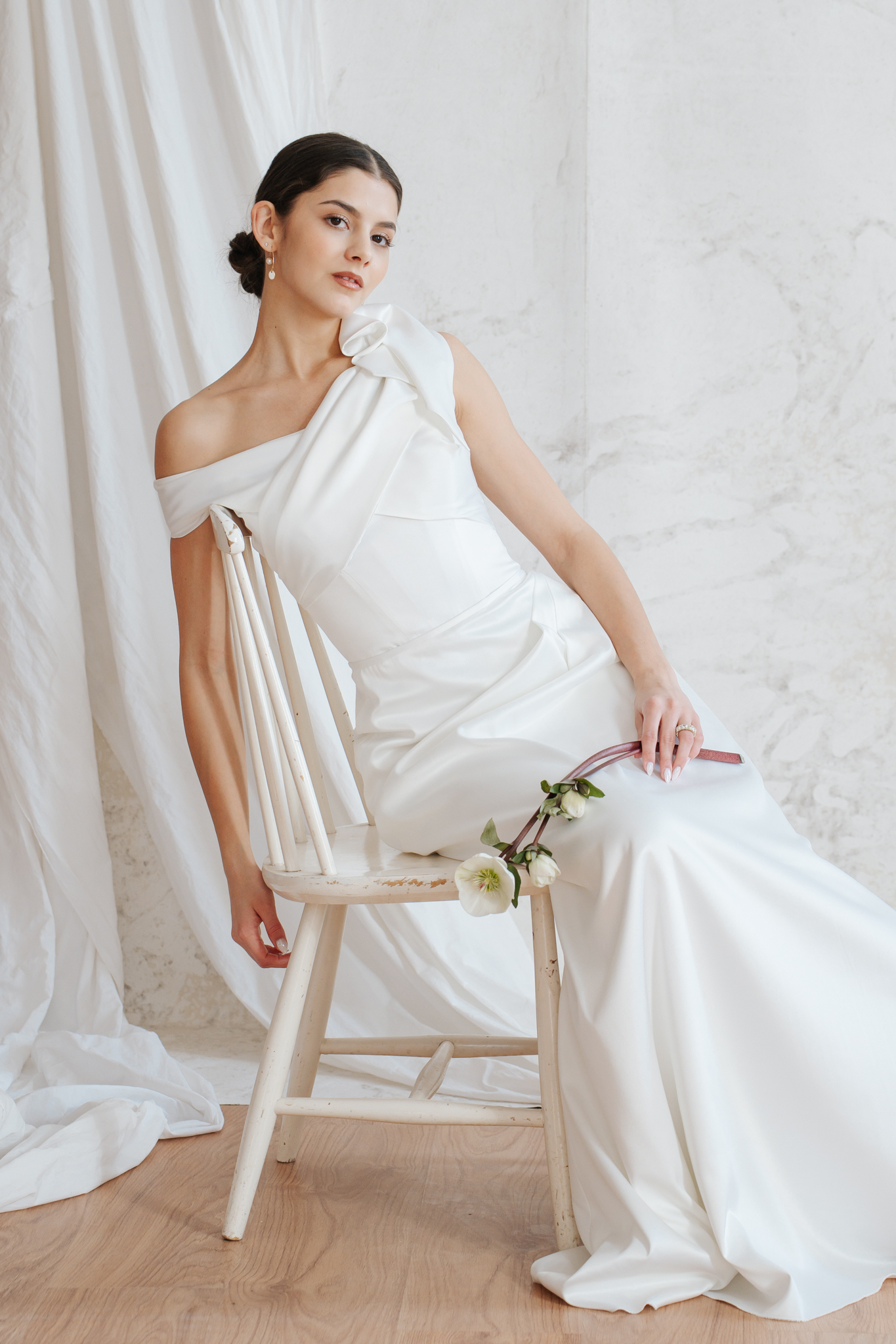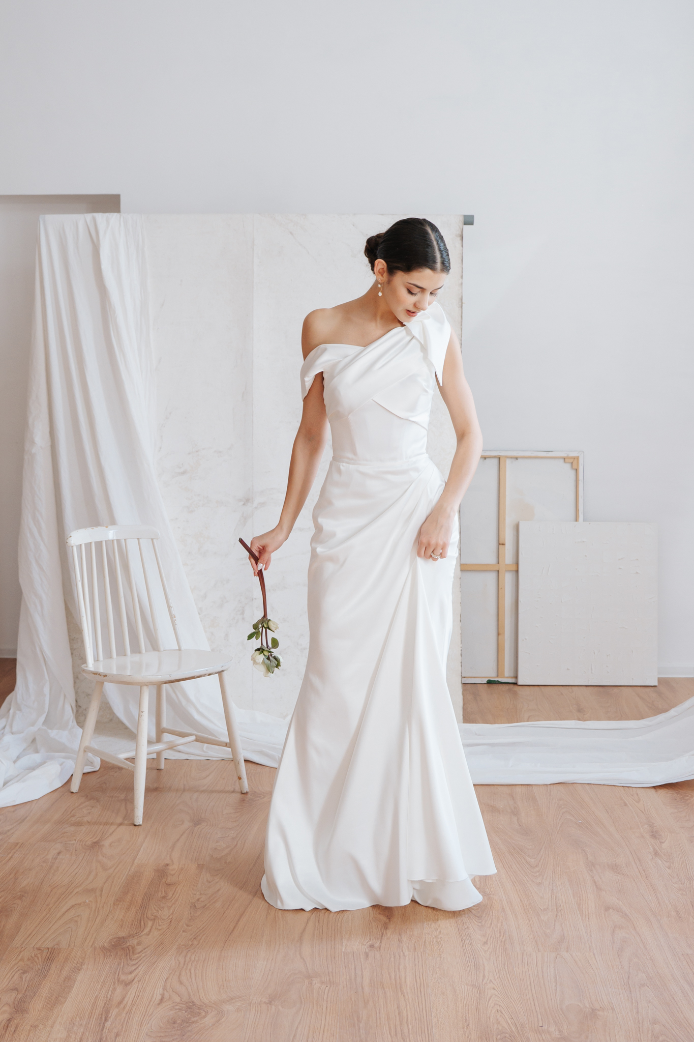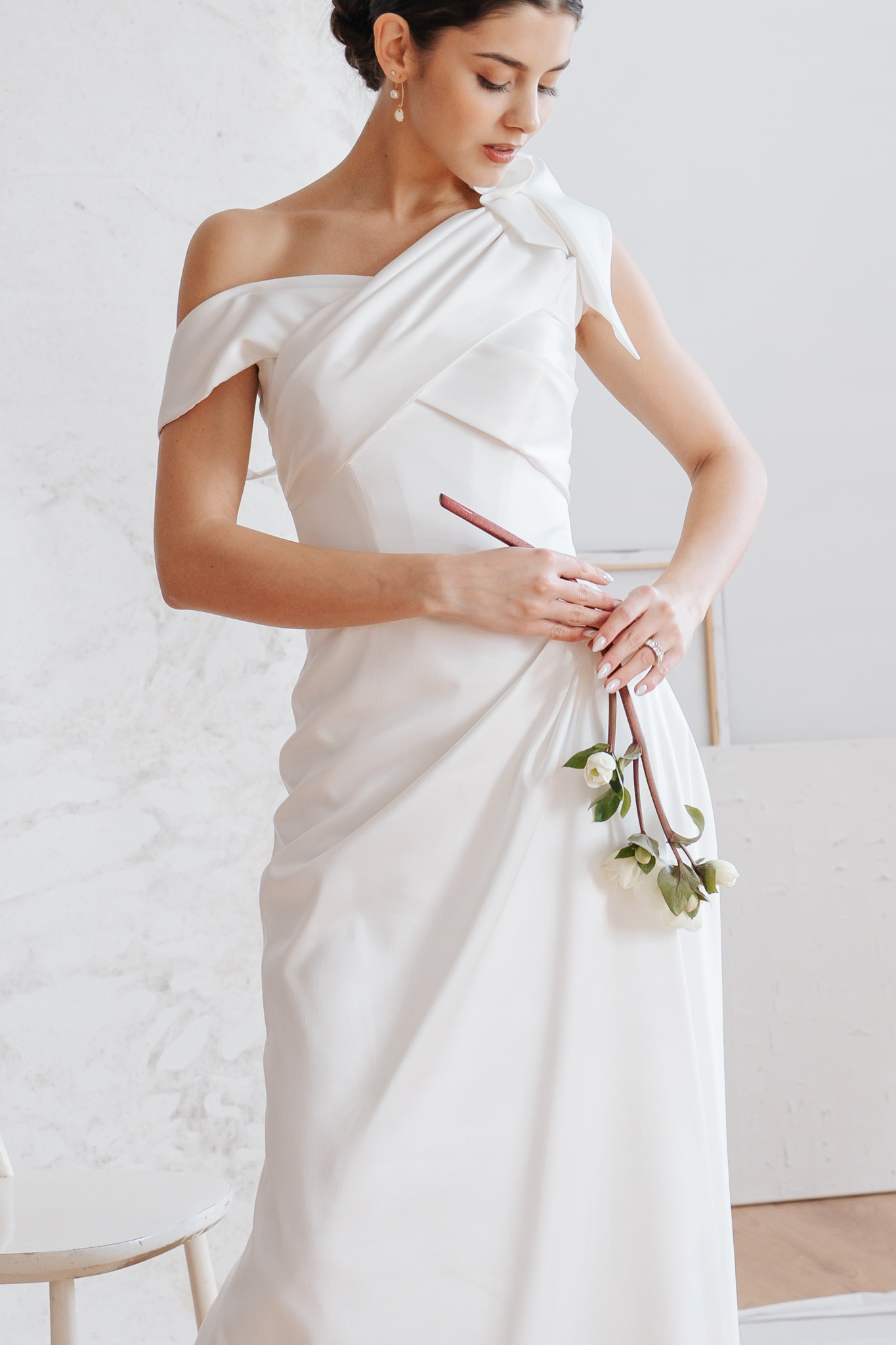 Hajtogatott textúrák és asszimetrikus elemek alkotják ezt a ruhát, mely az enyhe fényű szaténnak köszönhetően diszkrét luxust sugall. A minimalista hangulatok szerelmeseinek ajánljuk.