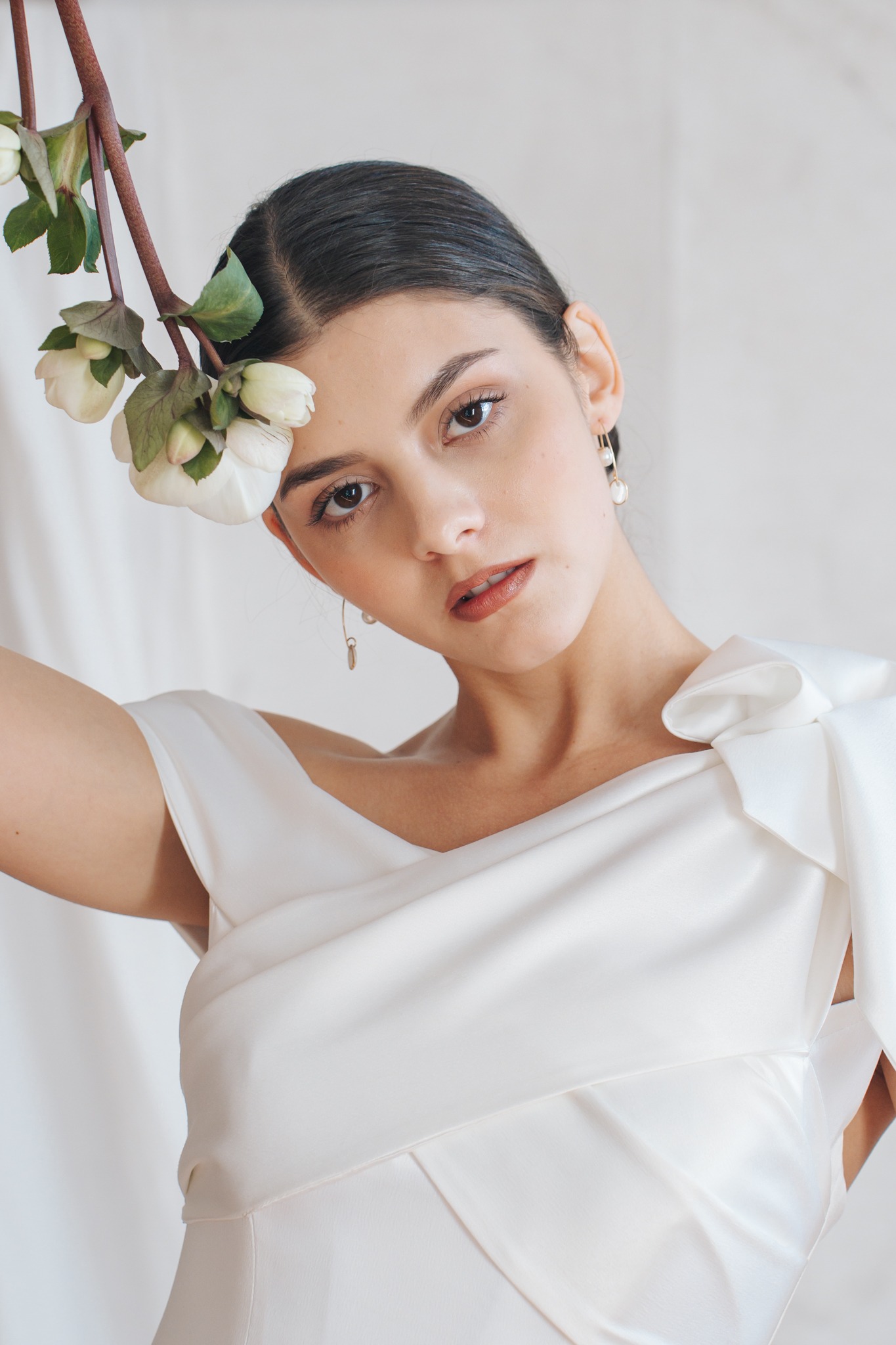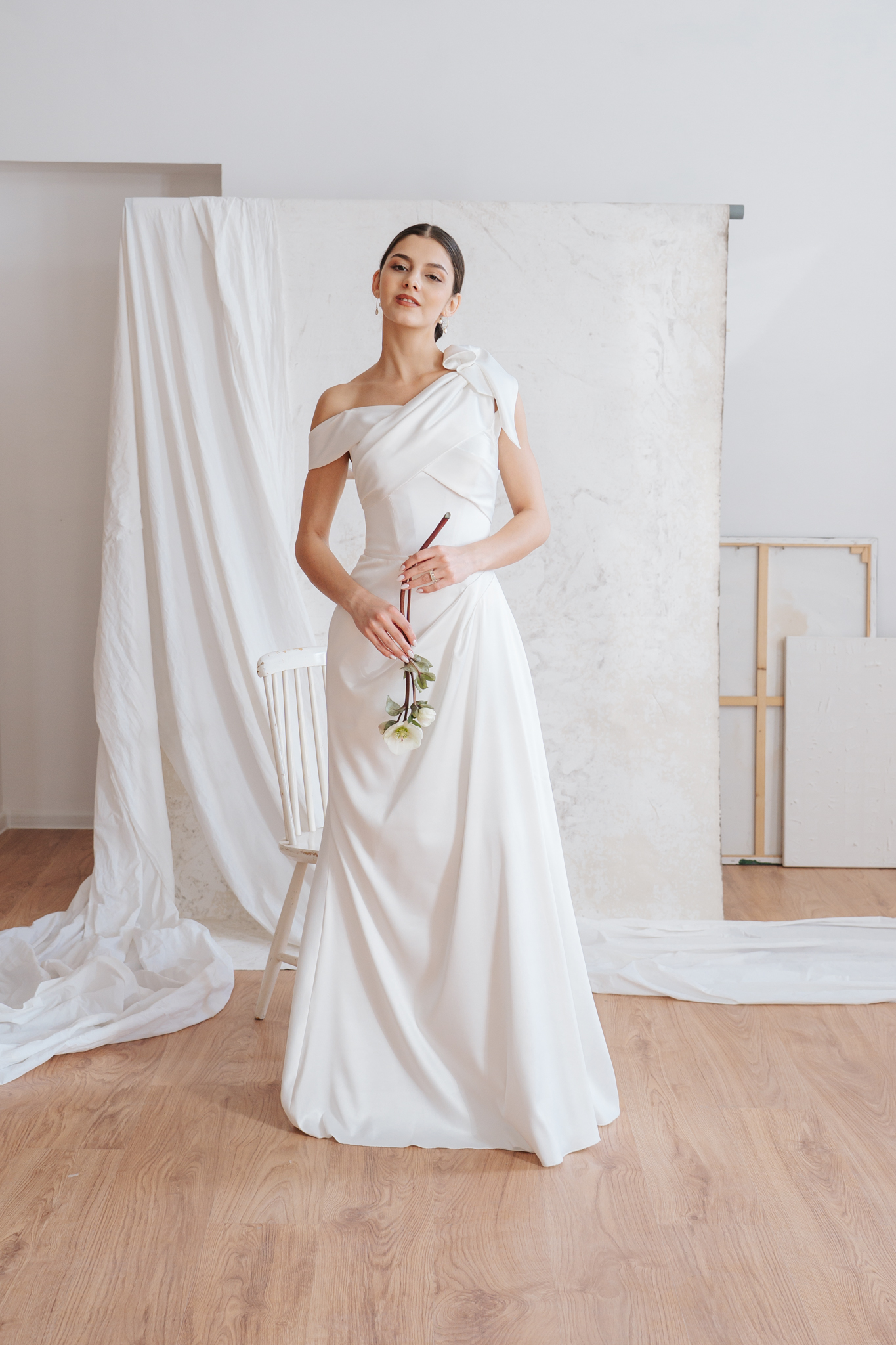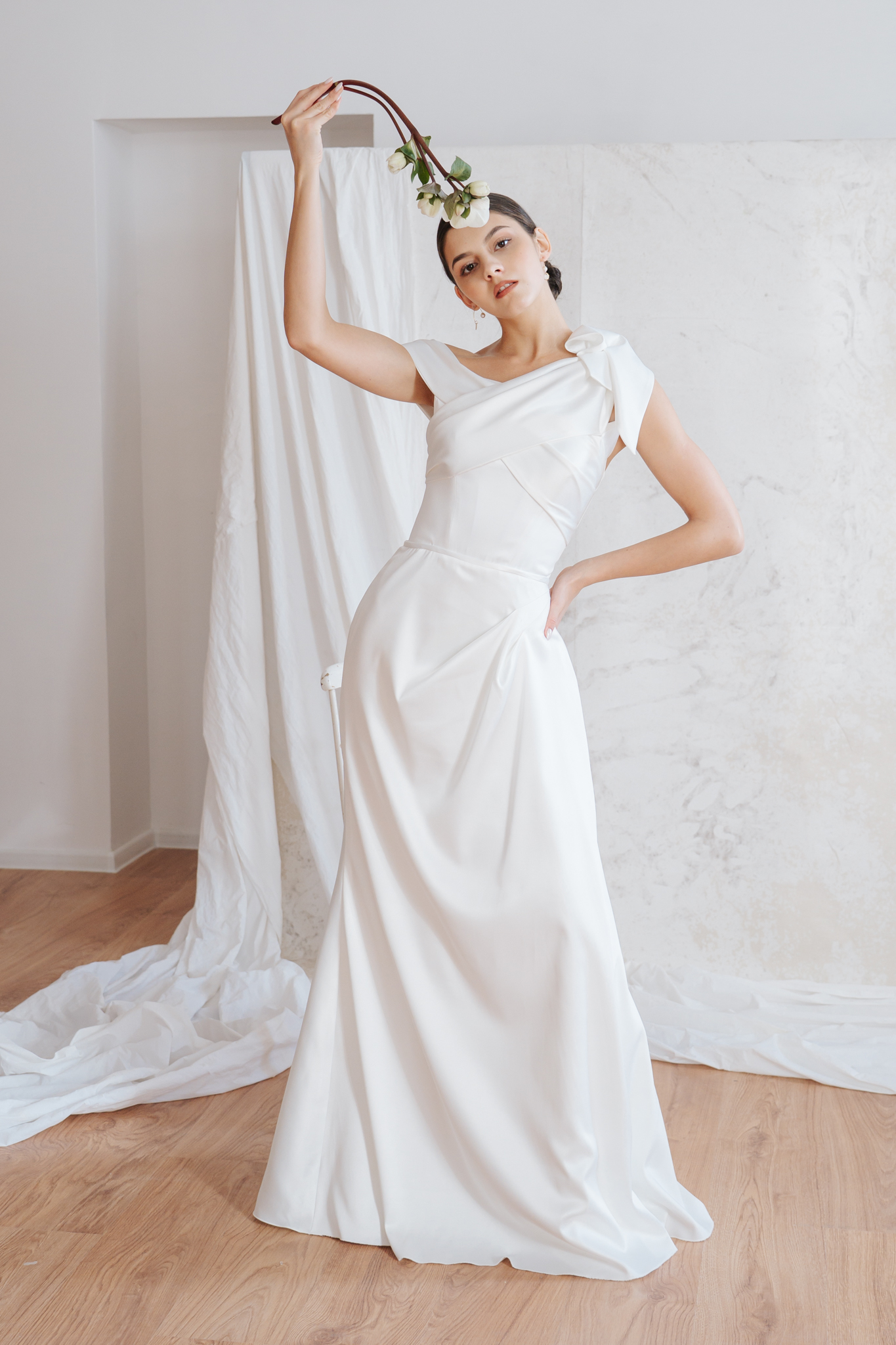 Hajtogatott textúrák és asszimetrikus elemek alkotják ezt a ruhát, mely az enyhe fényű szaténnak köszönhetően diszkrét luxust sugall. A minimalista hangulatok szerelmeseinek ajánljuk.