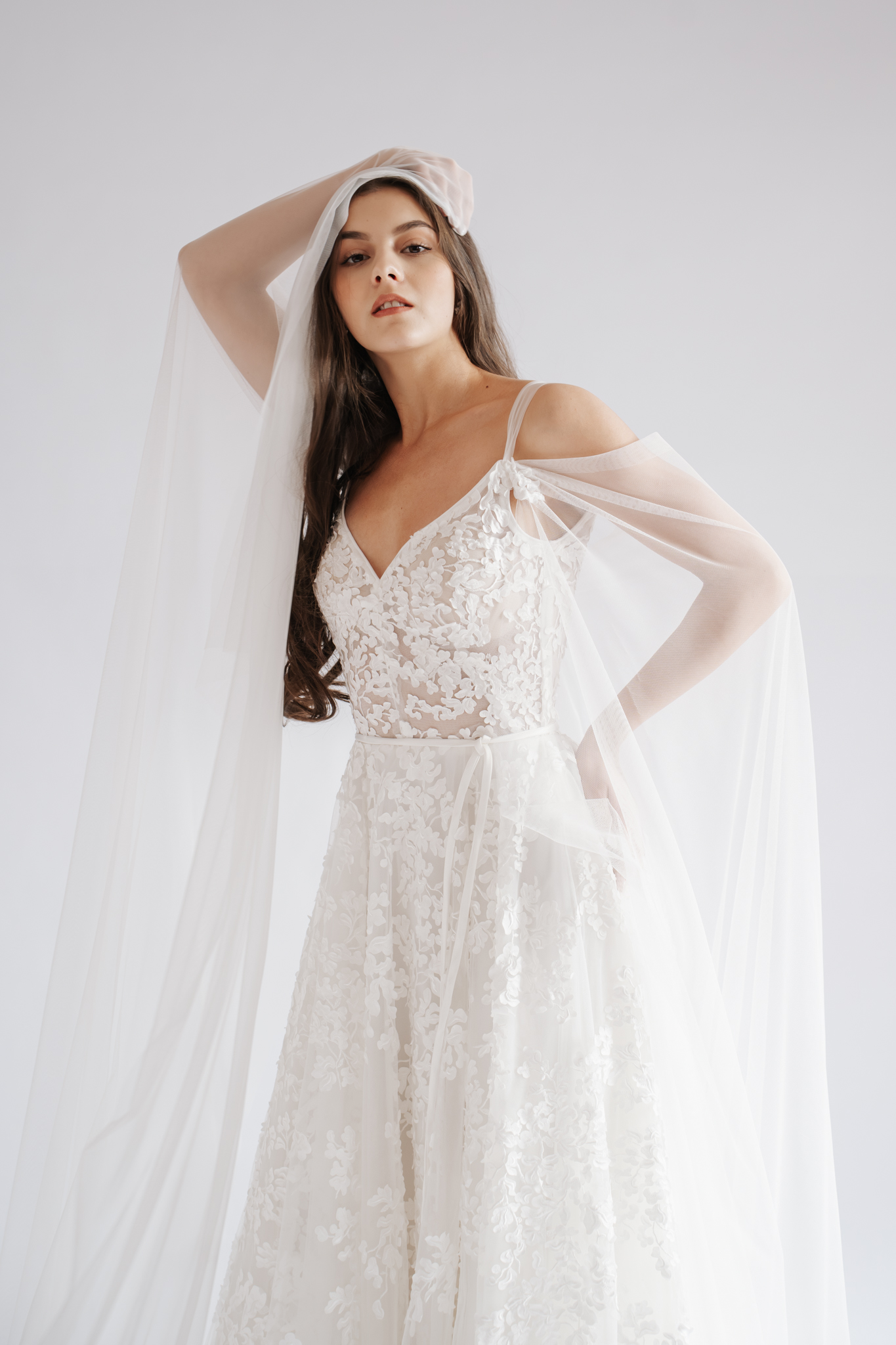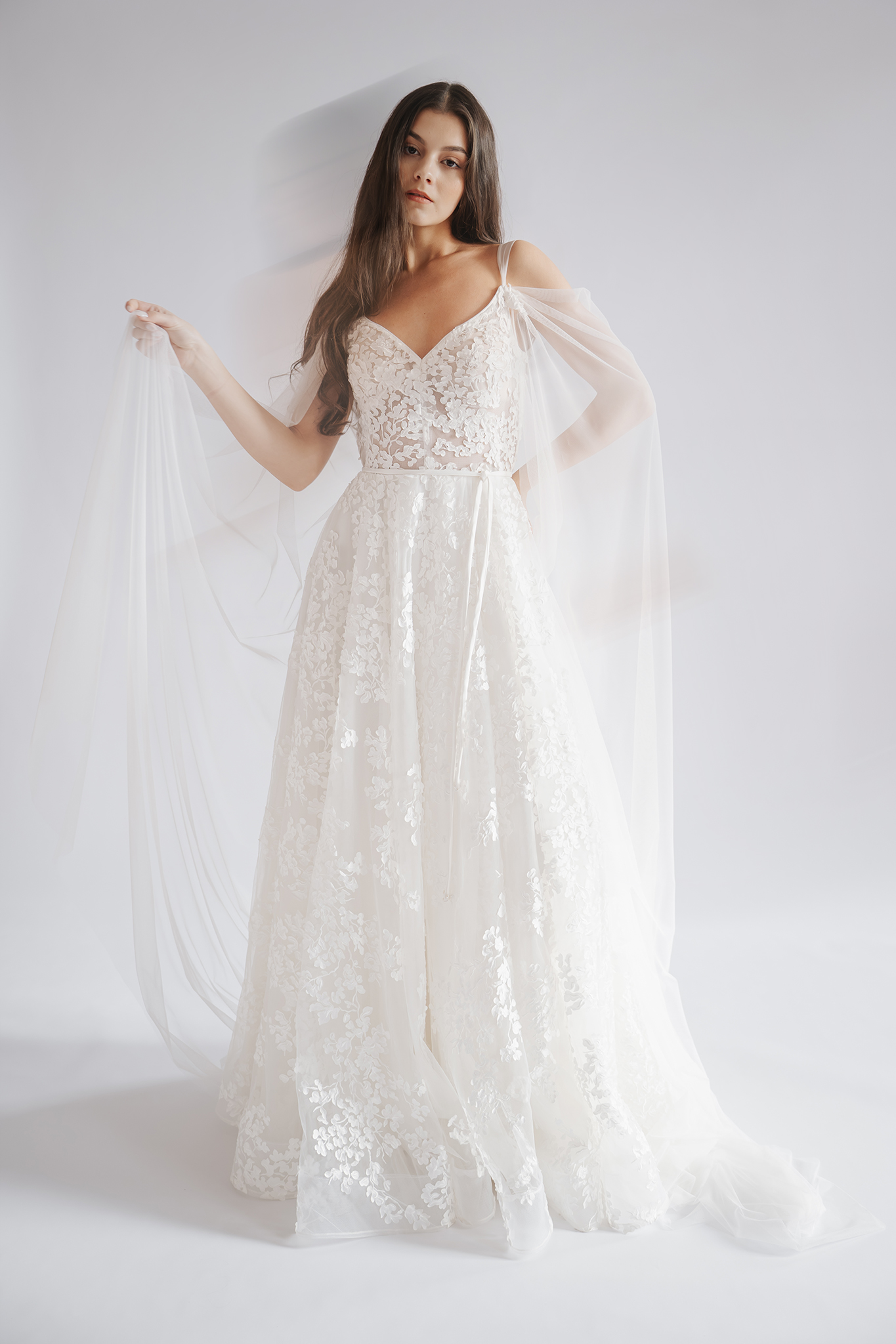 Igazi menyasszonyos romantikát sugall ez a teljes egészében csipkéből készült ruha. A kortárs, absztrakt mintája azoknak is szólhat akik a klasszikus hímzések helyett valami igazán különlegeset keresnek. Lecsatolható vállfátyollal egészítettük ki a még impozánsabb megjelenésért.