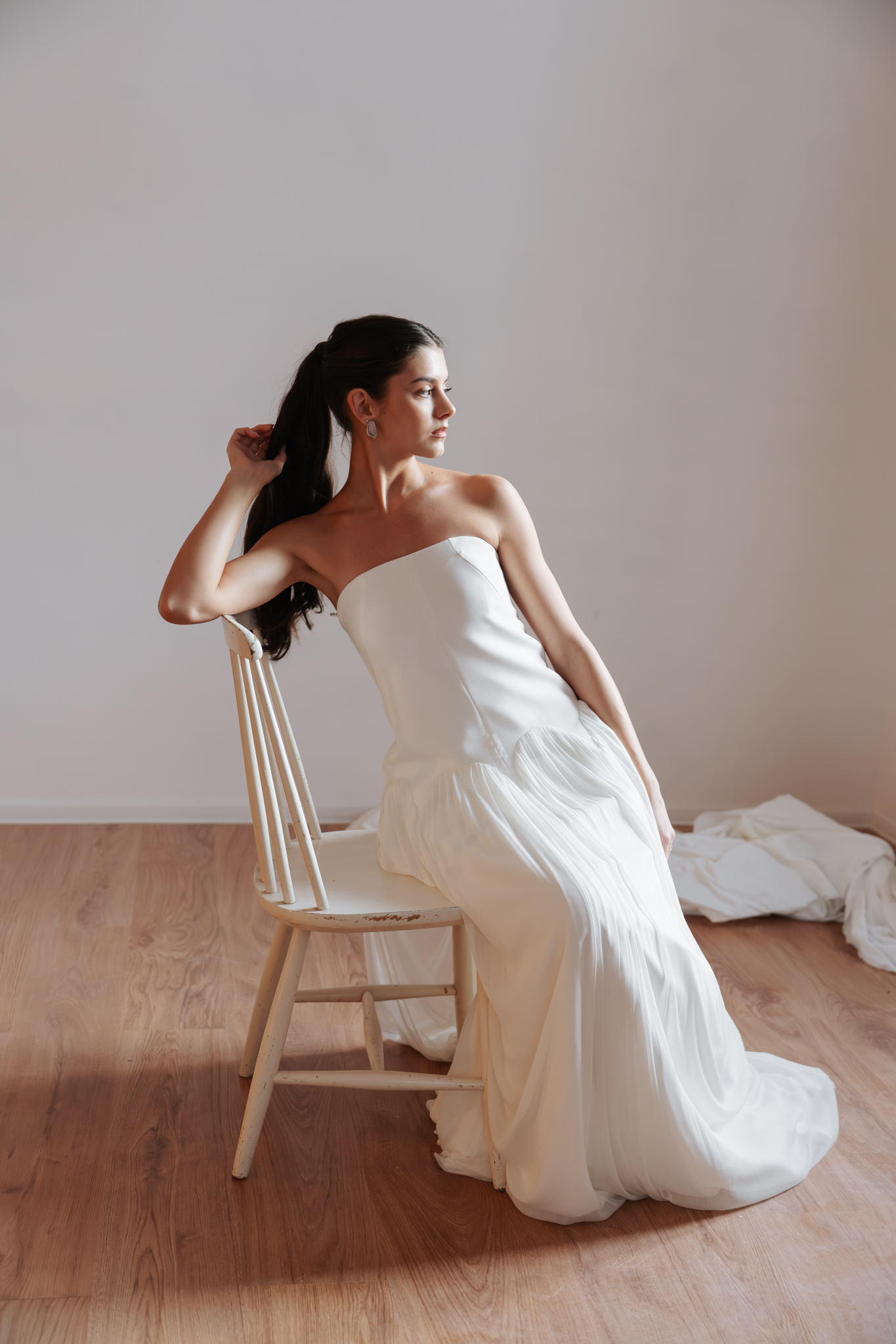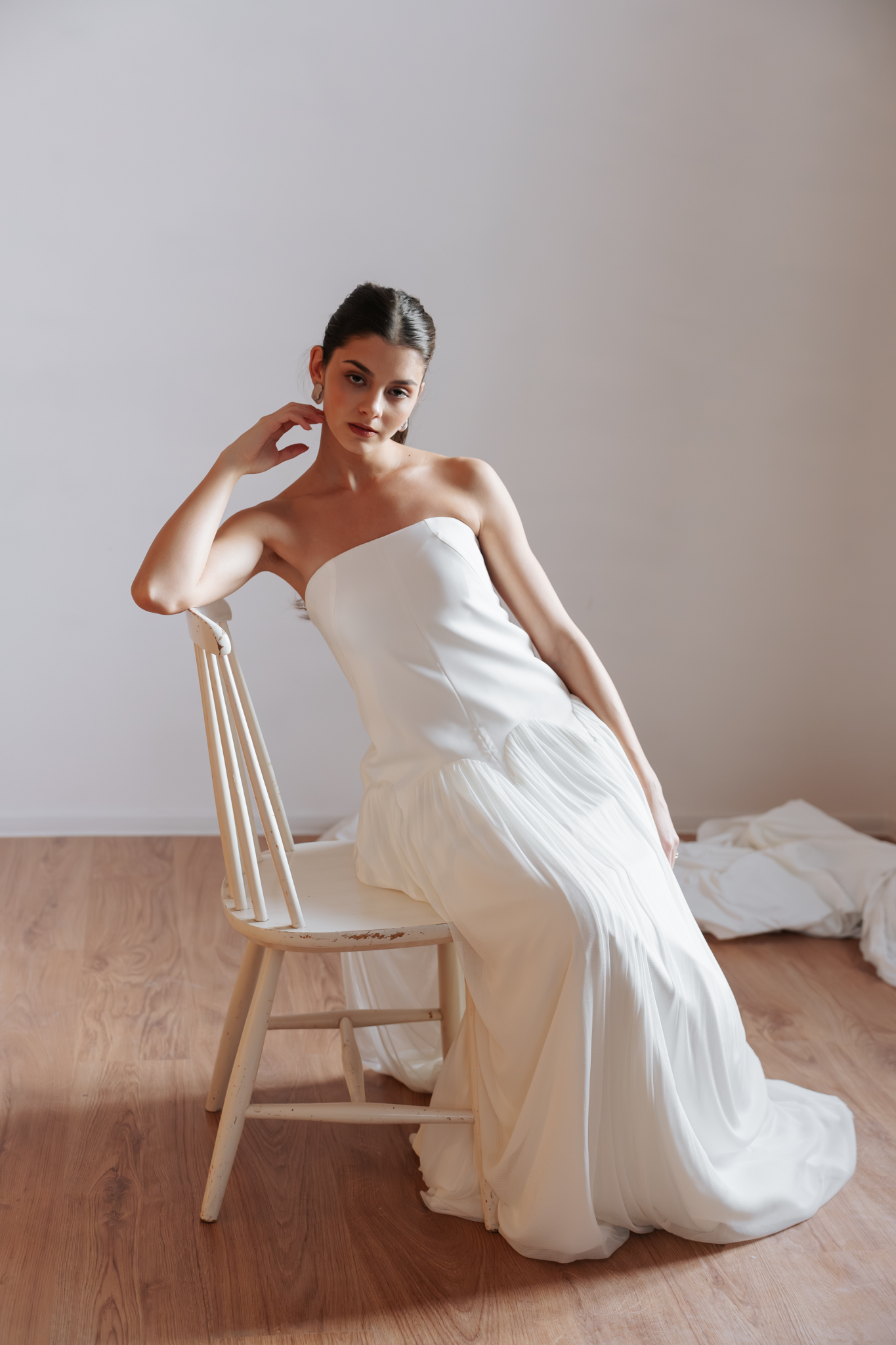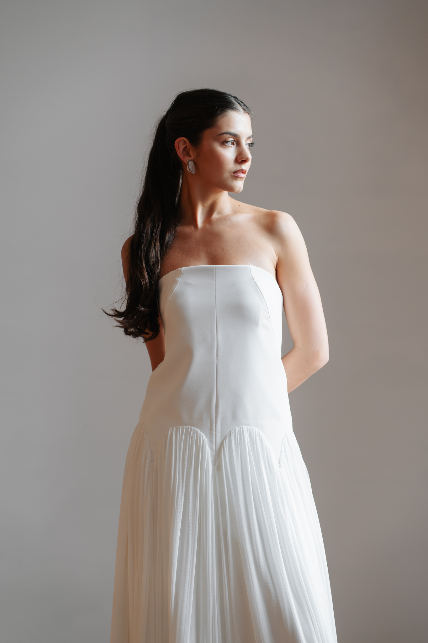 Laza szabású, kortárs vonalú a Leila ruha, az igazán modern menyasszonyok tökéletes választása lehet. Finom kreppzsorzset valamint puhán hulló selyemtüll alkotja.
