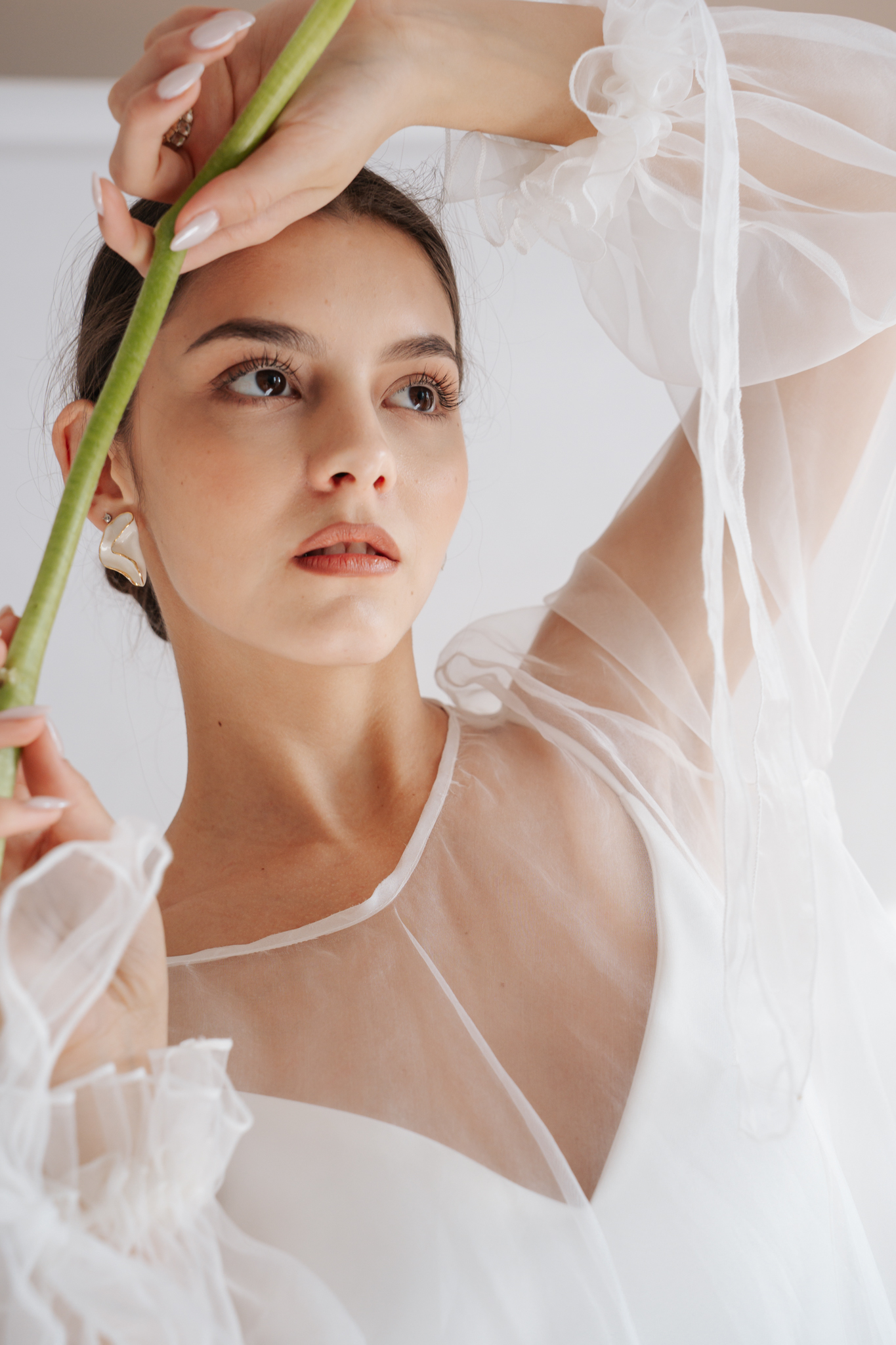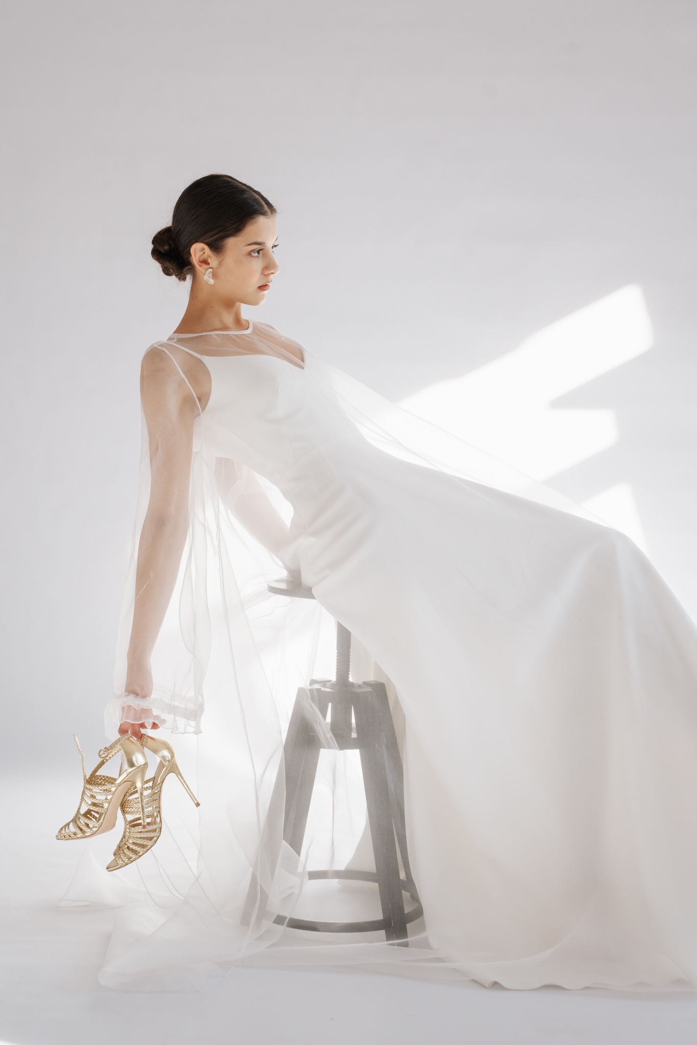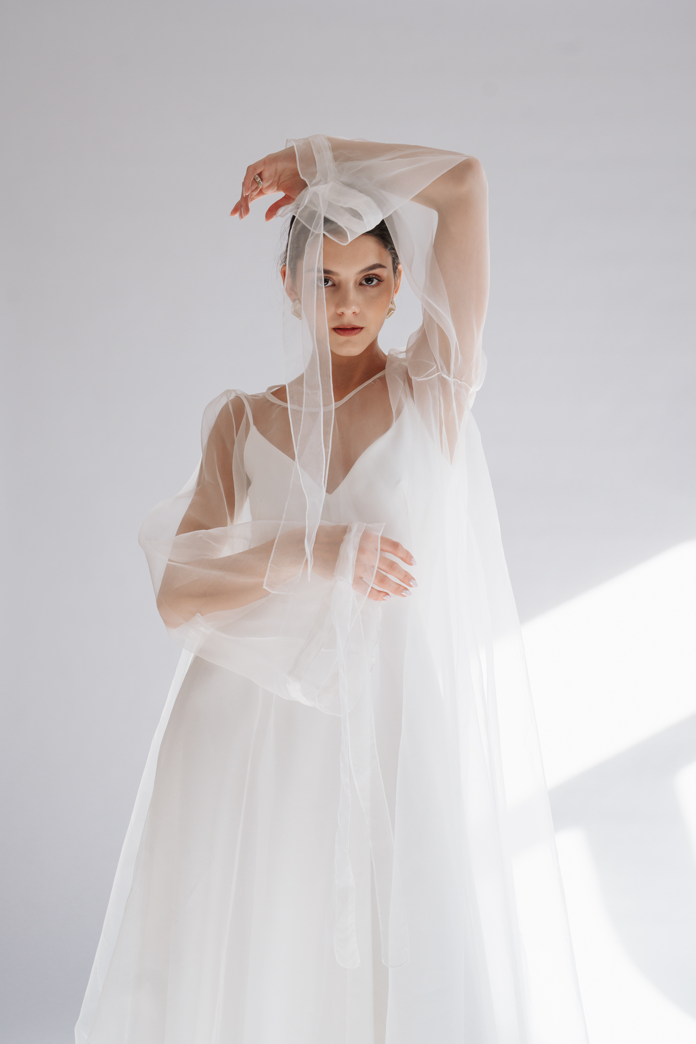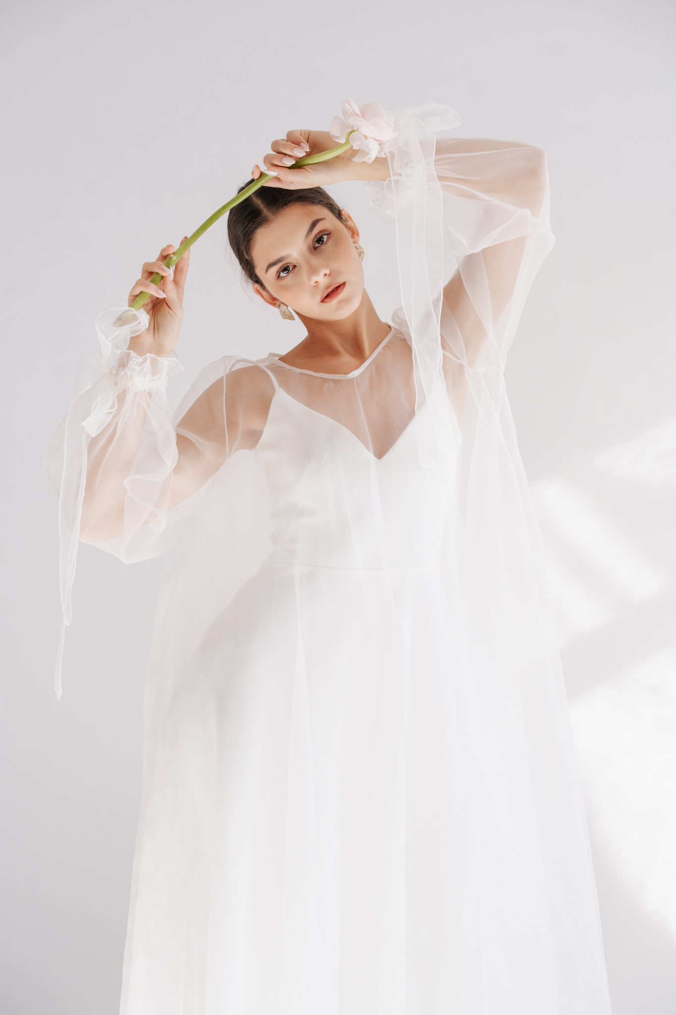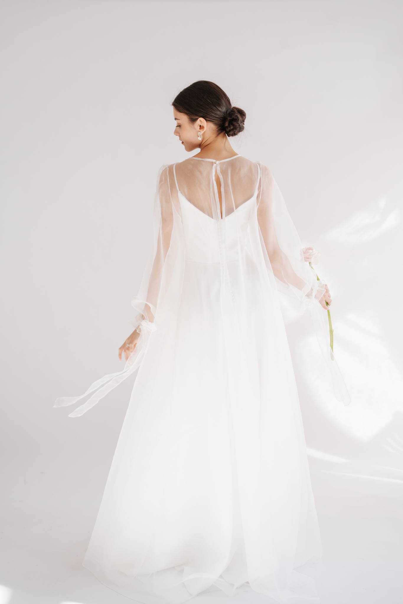 Kortárs szellemiséget tükröz és a modern menyasszonyoknak készült a Leoni ruha selyem organza rátéttel. Ez a kétrészes szett a különálló alapruhával és áttetsző felső rétegével a bulis esküvők tökéletes viselete lehet, de az egyházi szertartások eleganciájához is megfelelő.