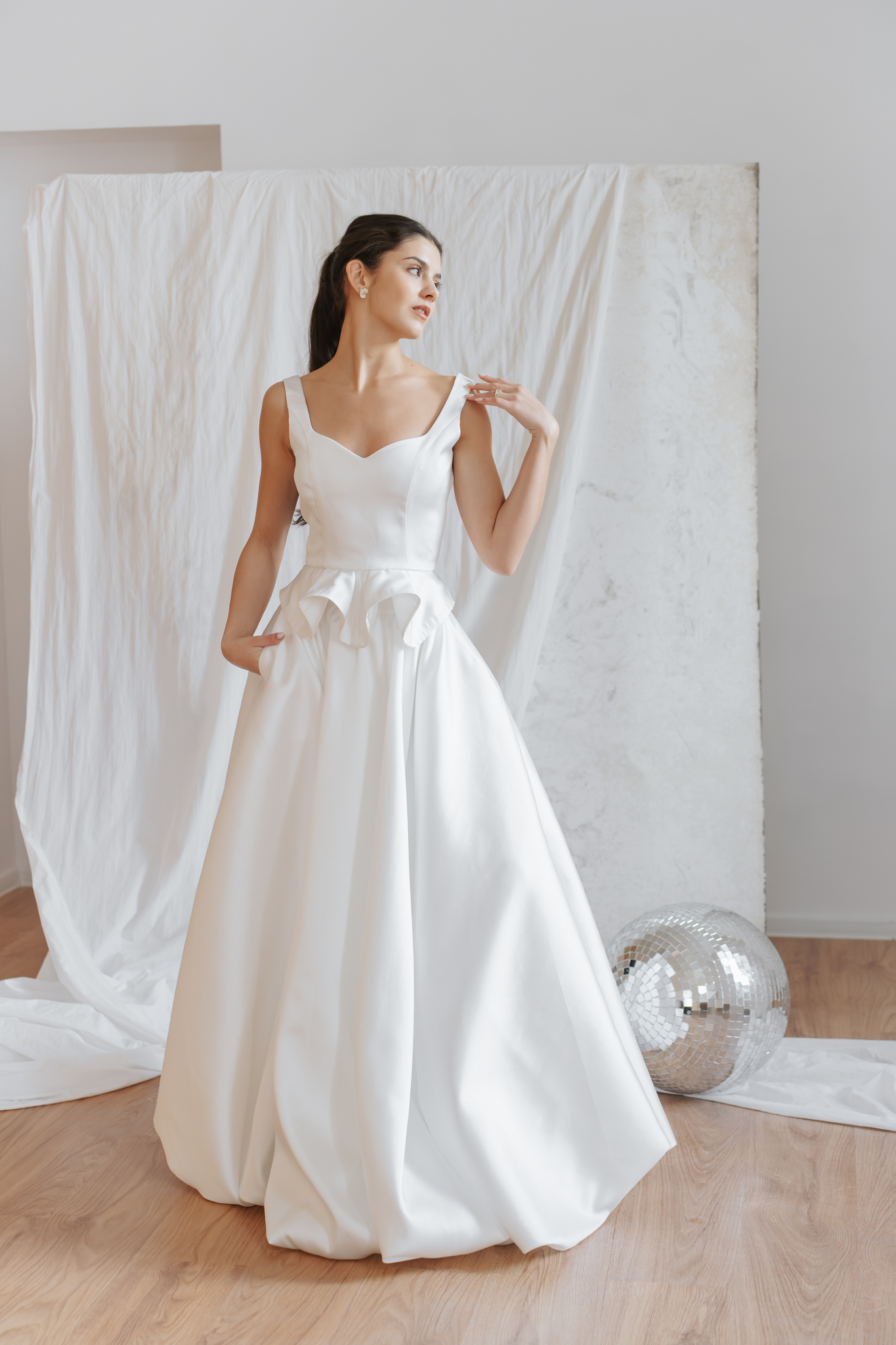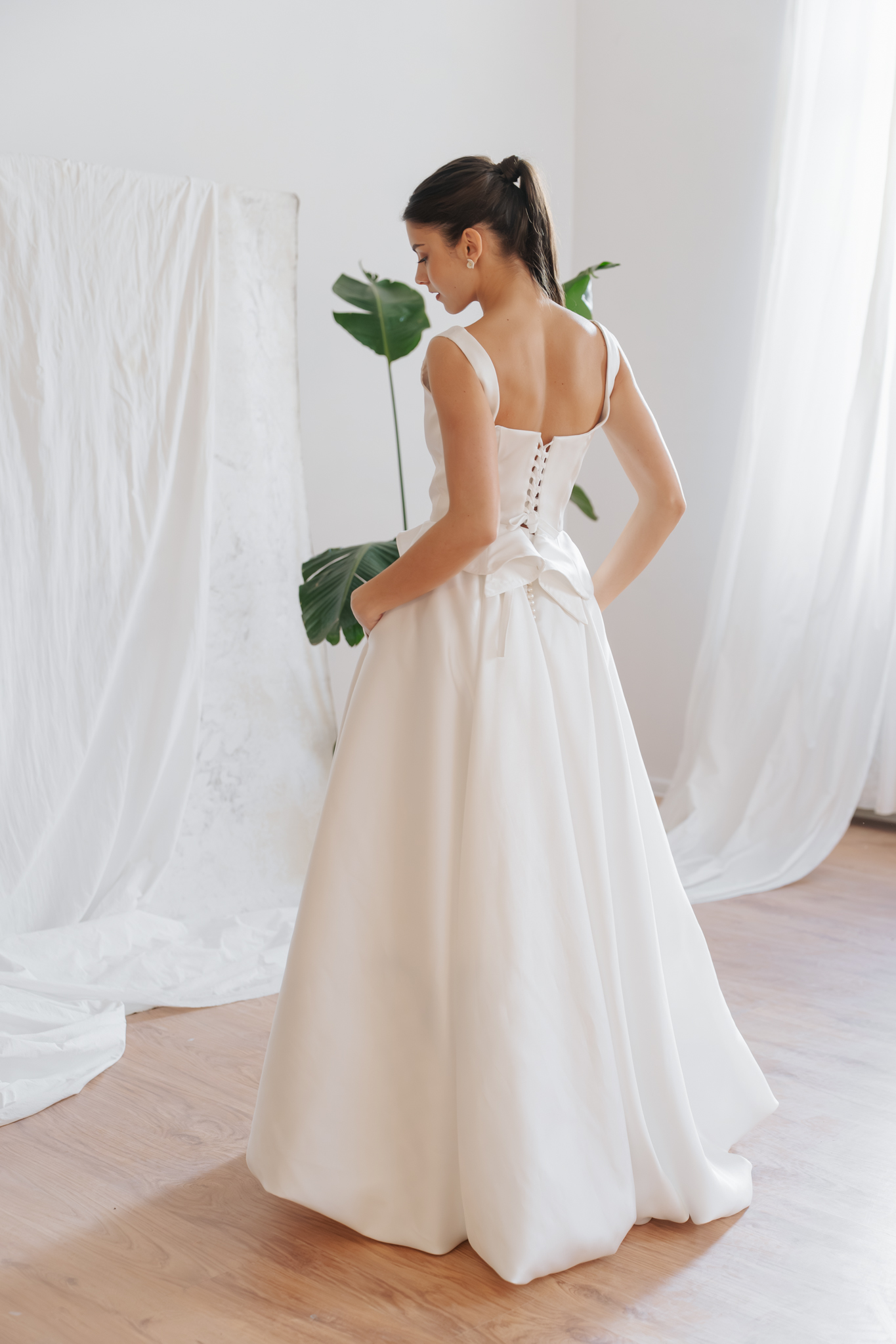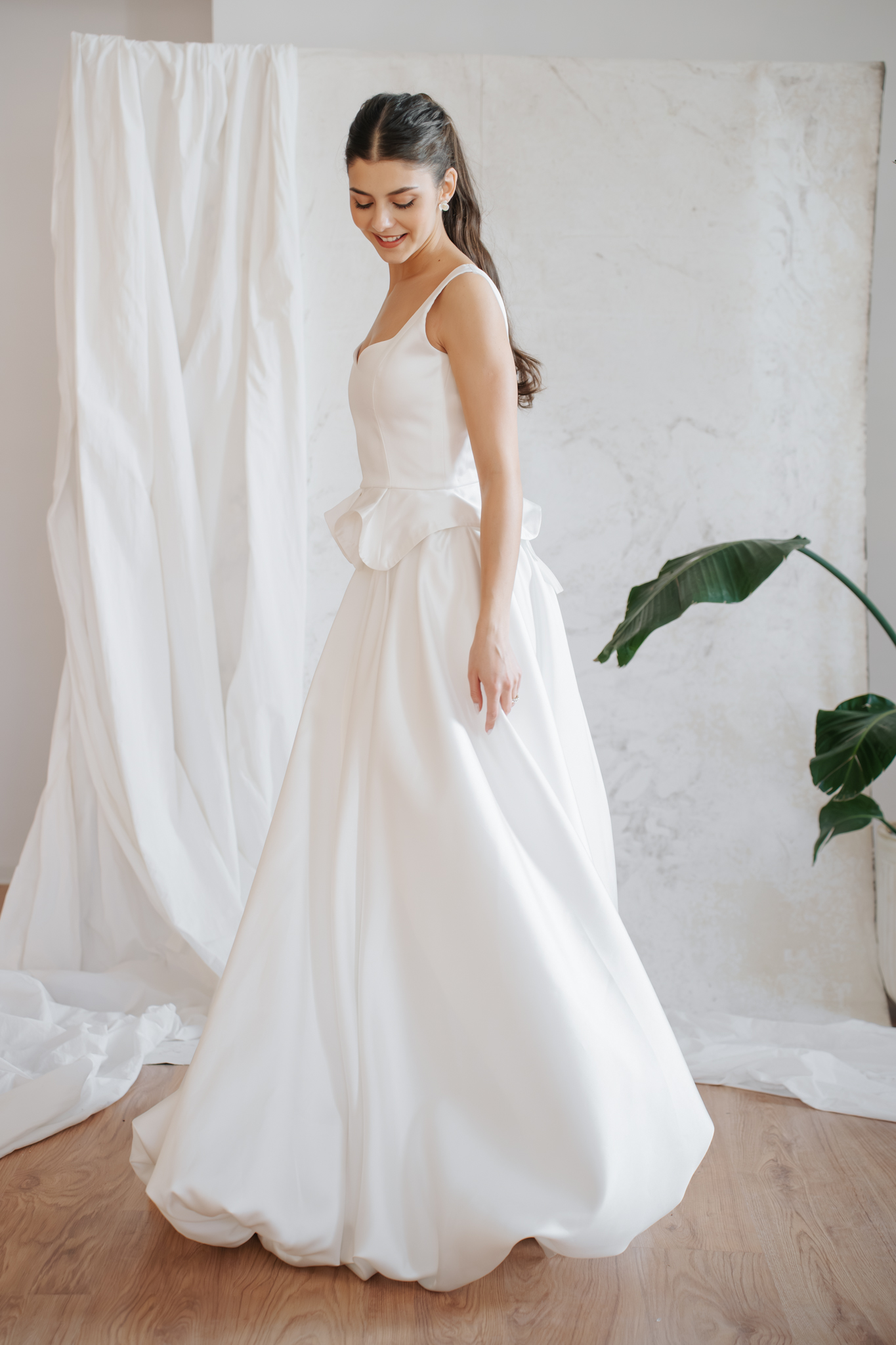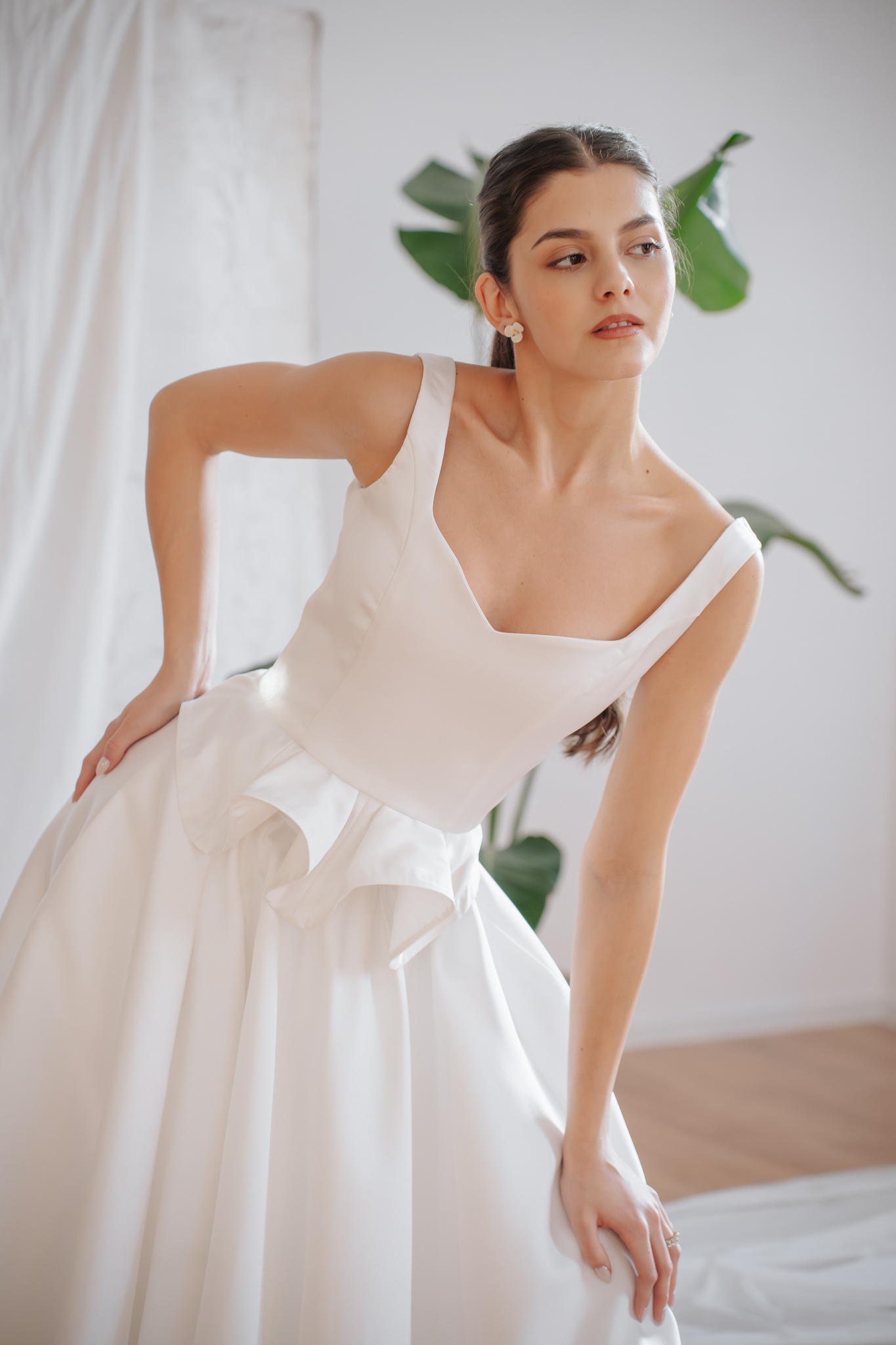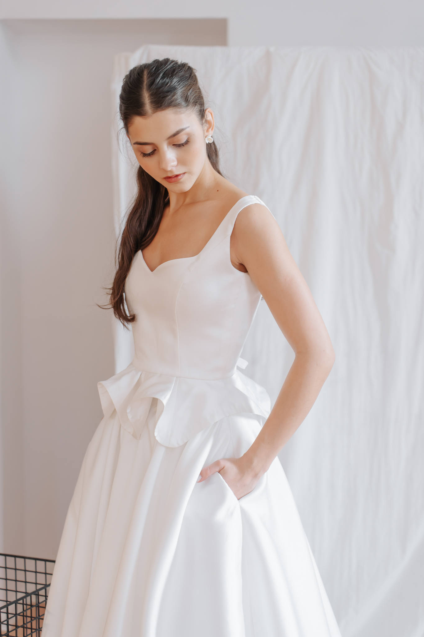 Peplumos felső és gazdag mikádó szoknya kettőse alkotja a Lili ruhát. Mivel külön álló elemekből terveztük így jól alakítható a menyasszony, valamint az esküvő hangulatához. A domináns textúrájú szoknyát könnyedén lehet lágyabbra, de akár egy jól szabott nadrágra is váltani a partyhoz adaptálva.
