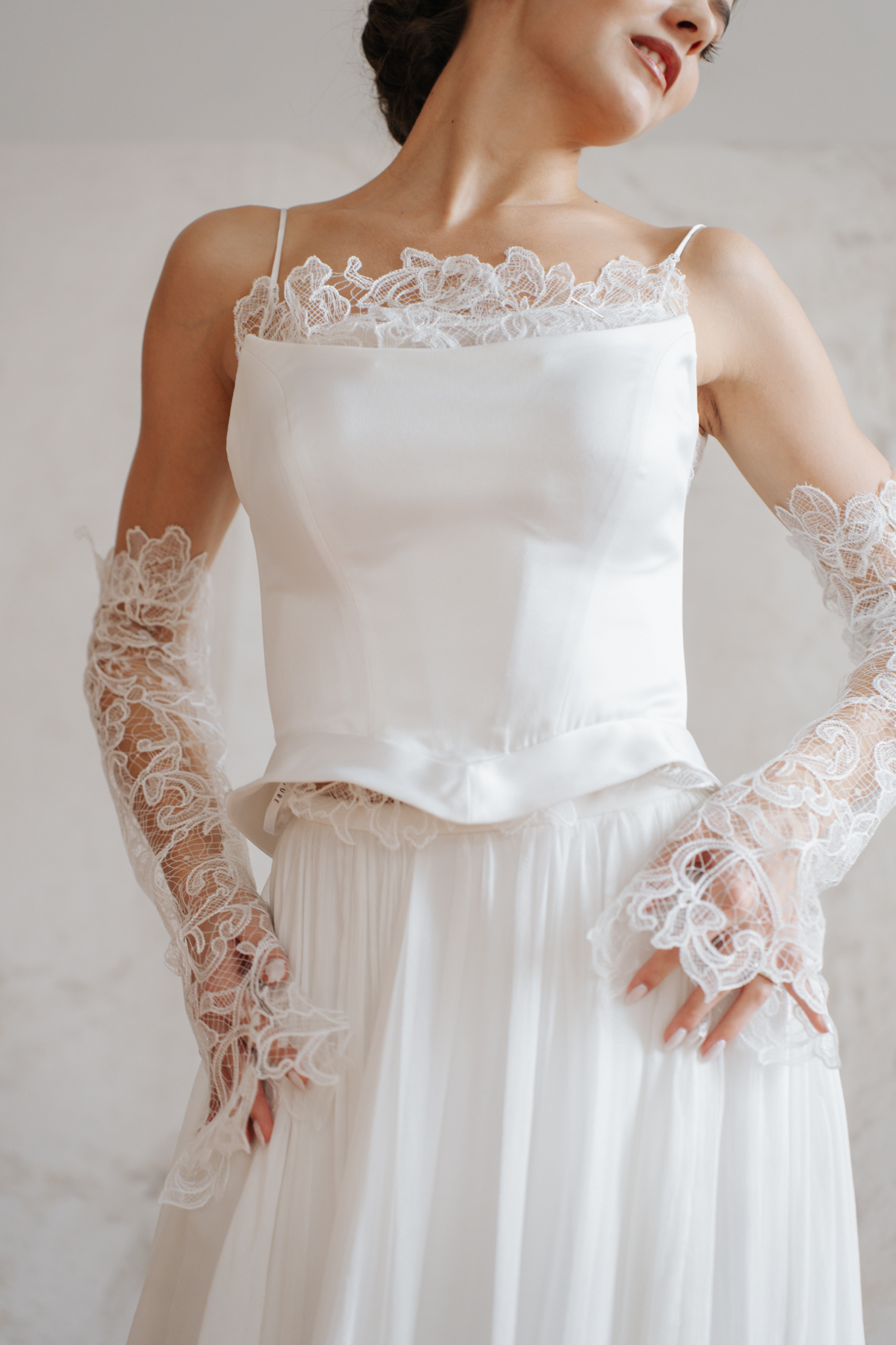 Ez a több komponensű ruha a Lexa kiegészítése egy modern, divatos korszettel. Finom csipkeminta és a strukturált korszett alkotja, melyet a csipke kesztyű varázsol igazán divatossá.