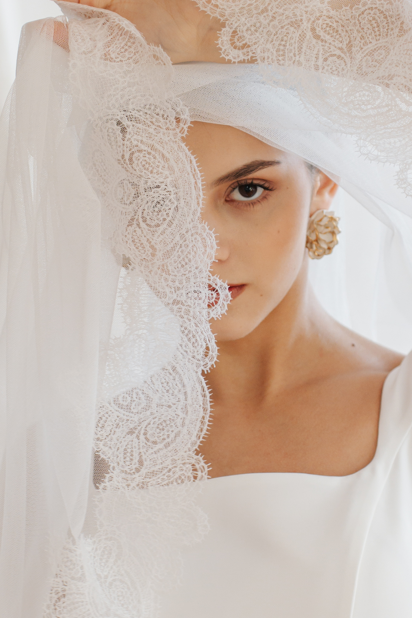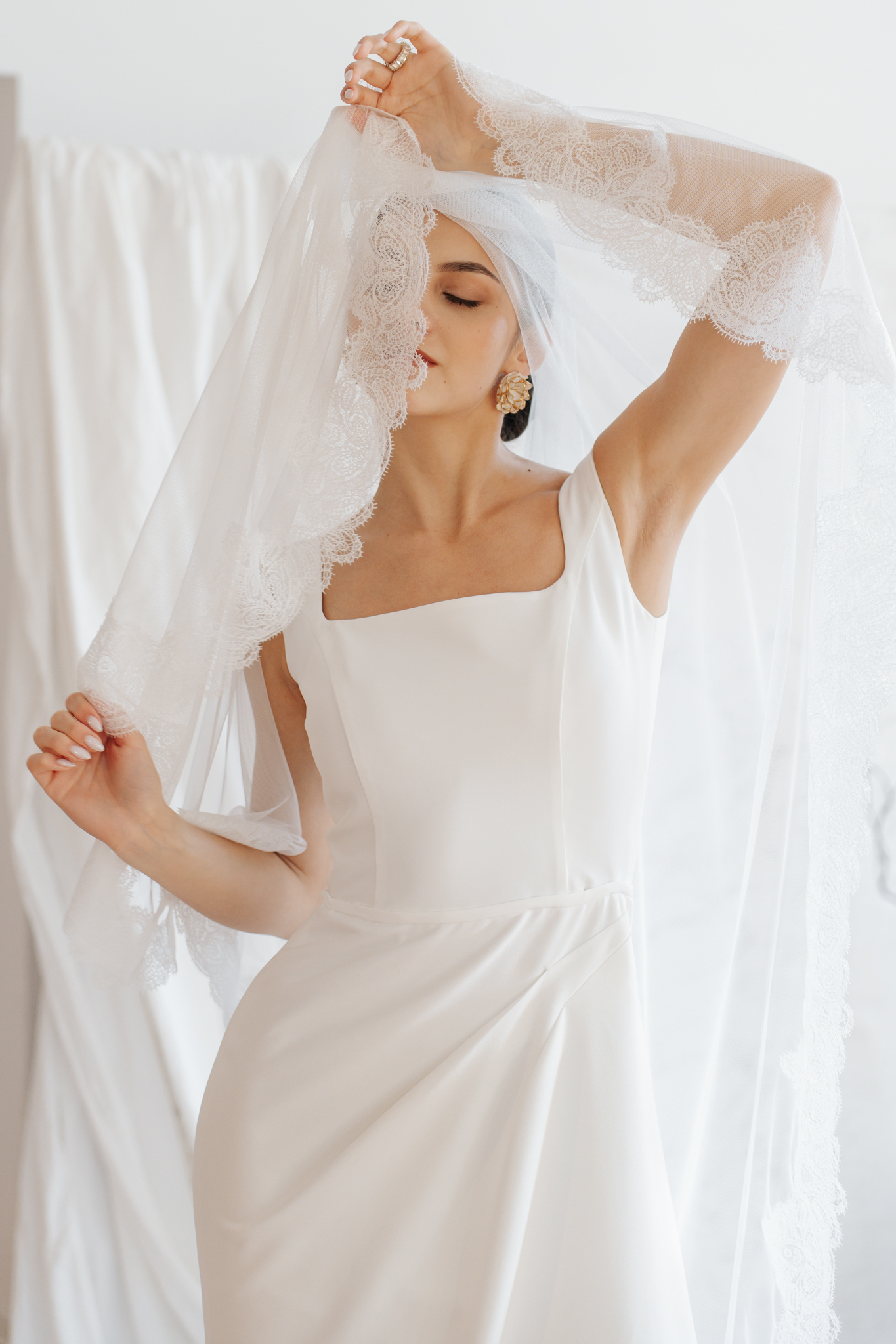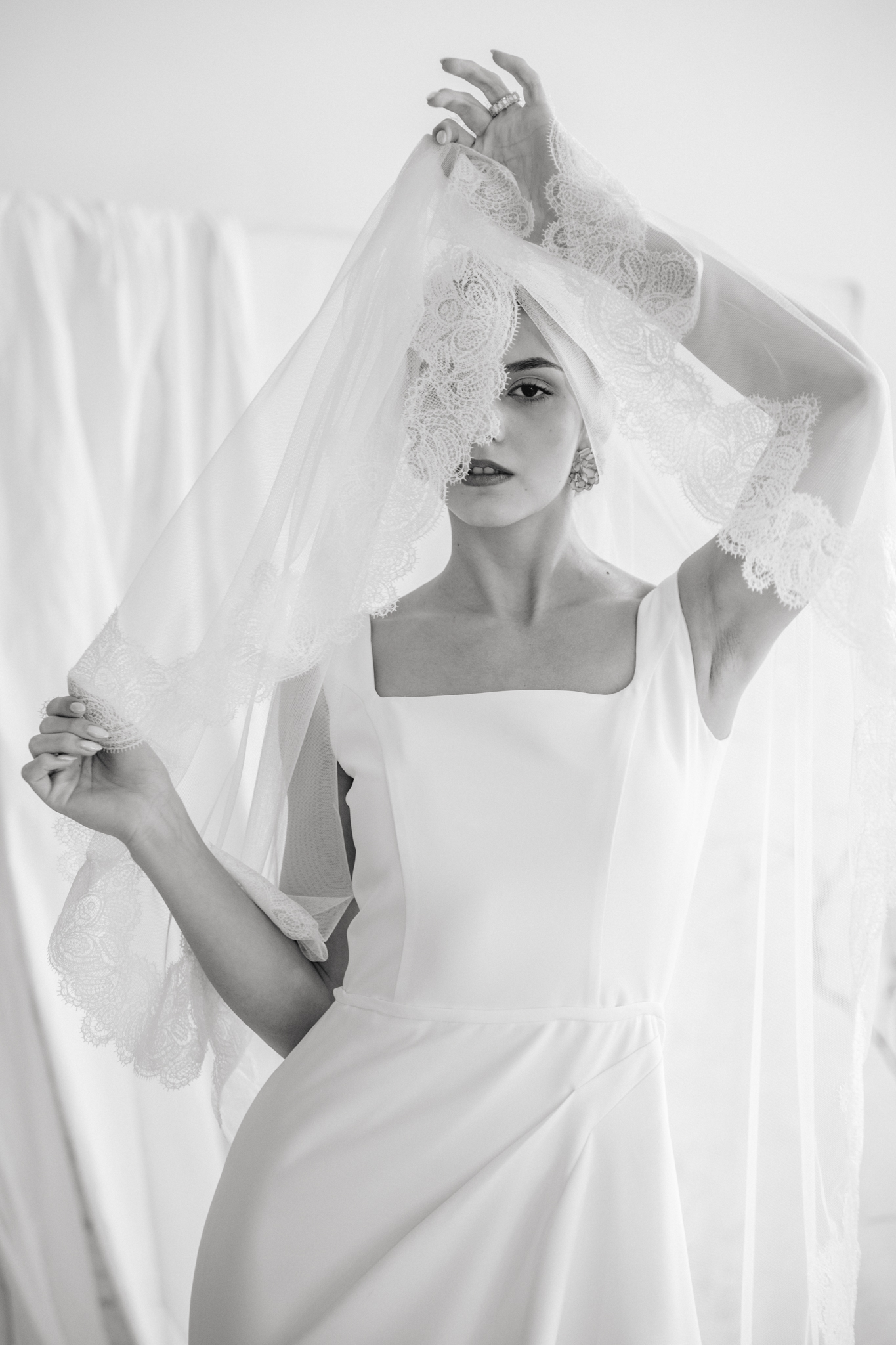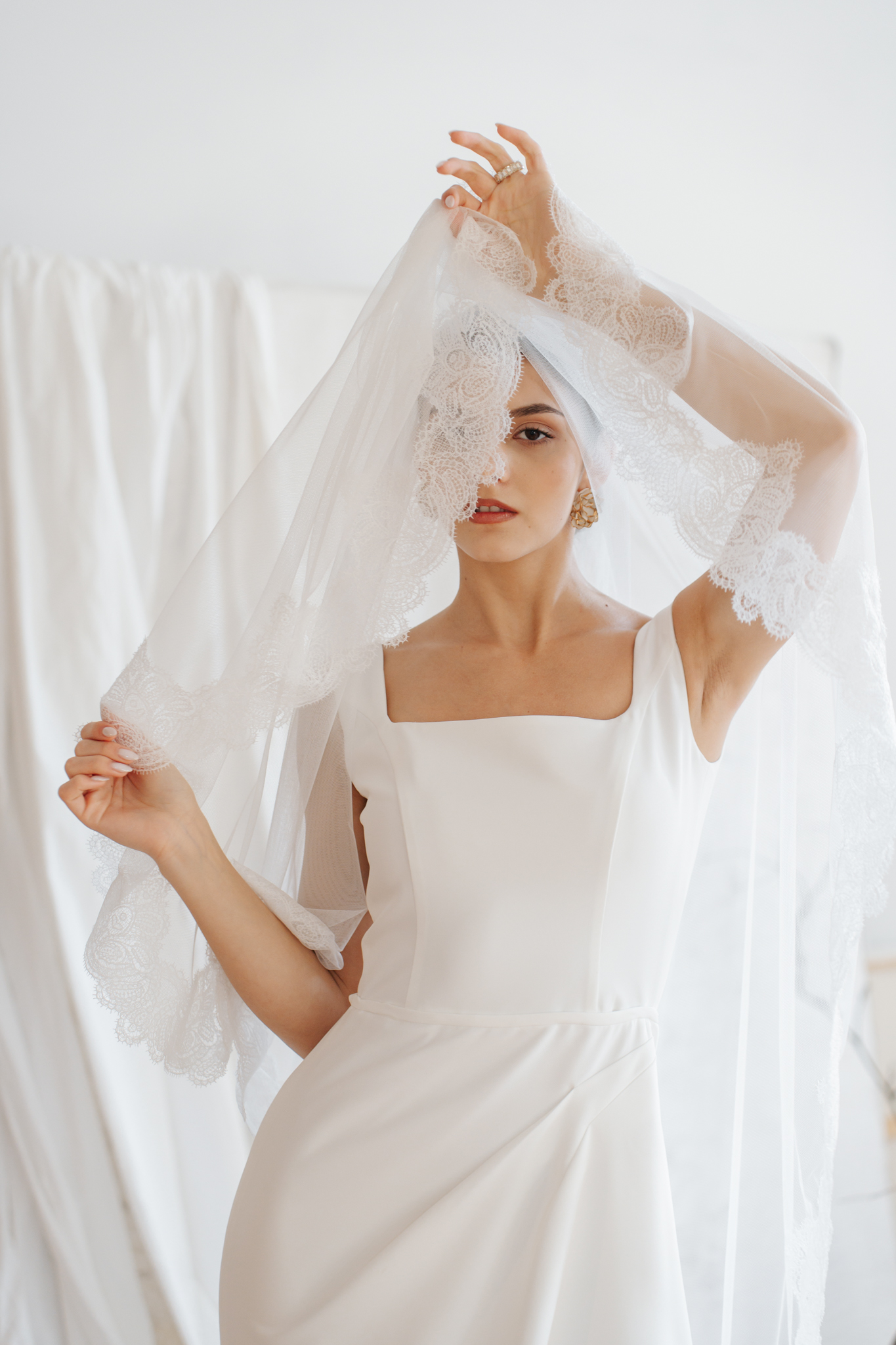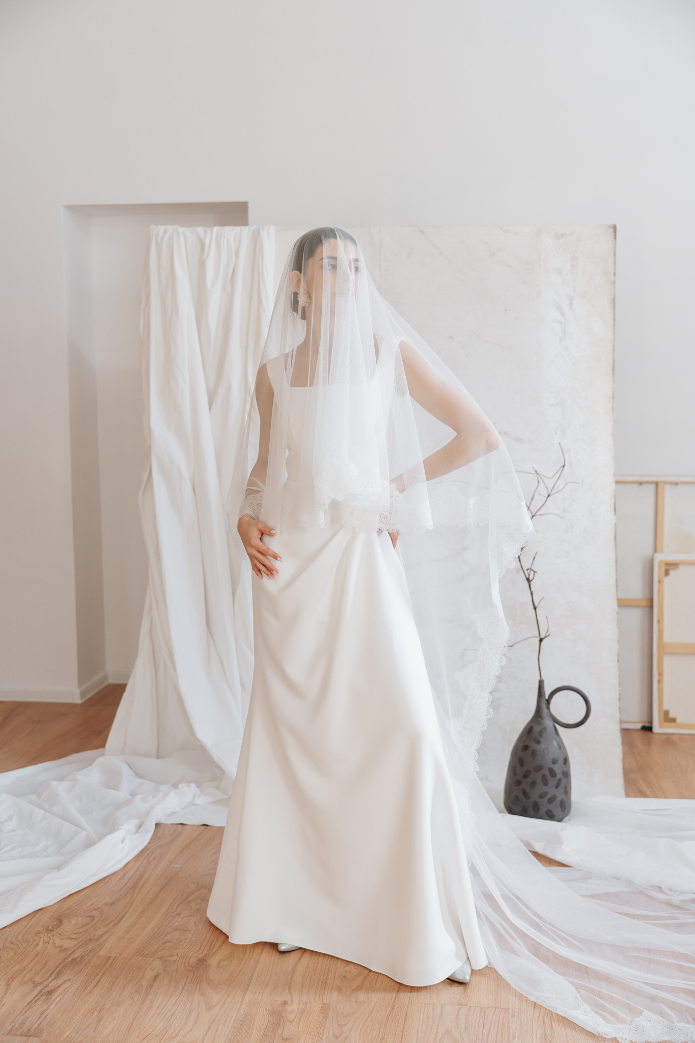 A klasszikus, örökérvényű elegancia szerelmeseinek kiegészítője a franciacsipke bordűrrel díszített hosszú fátyol. A letisztult vonalú ruháink mellé ajánljuk.
