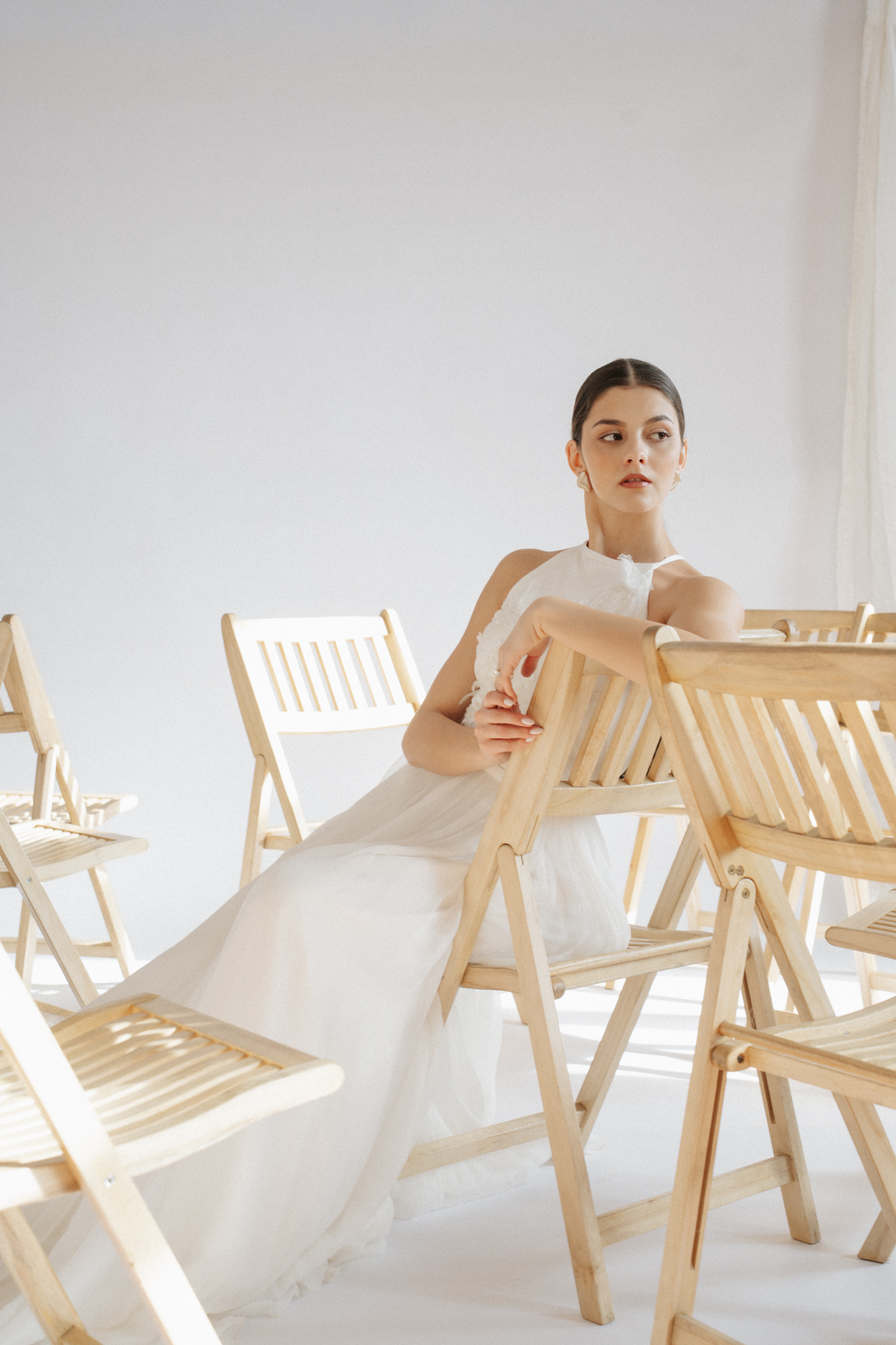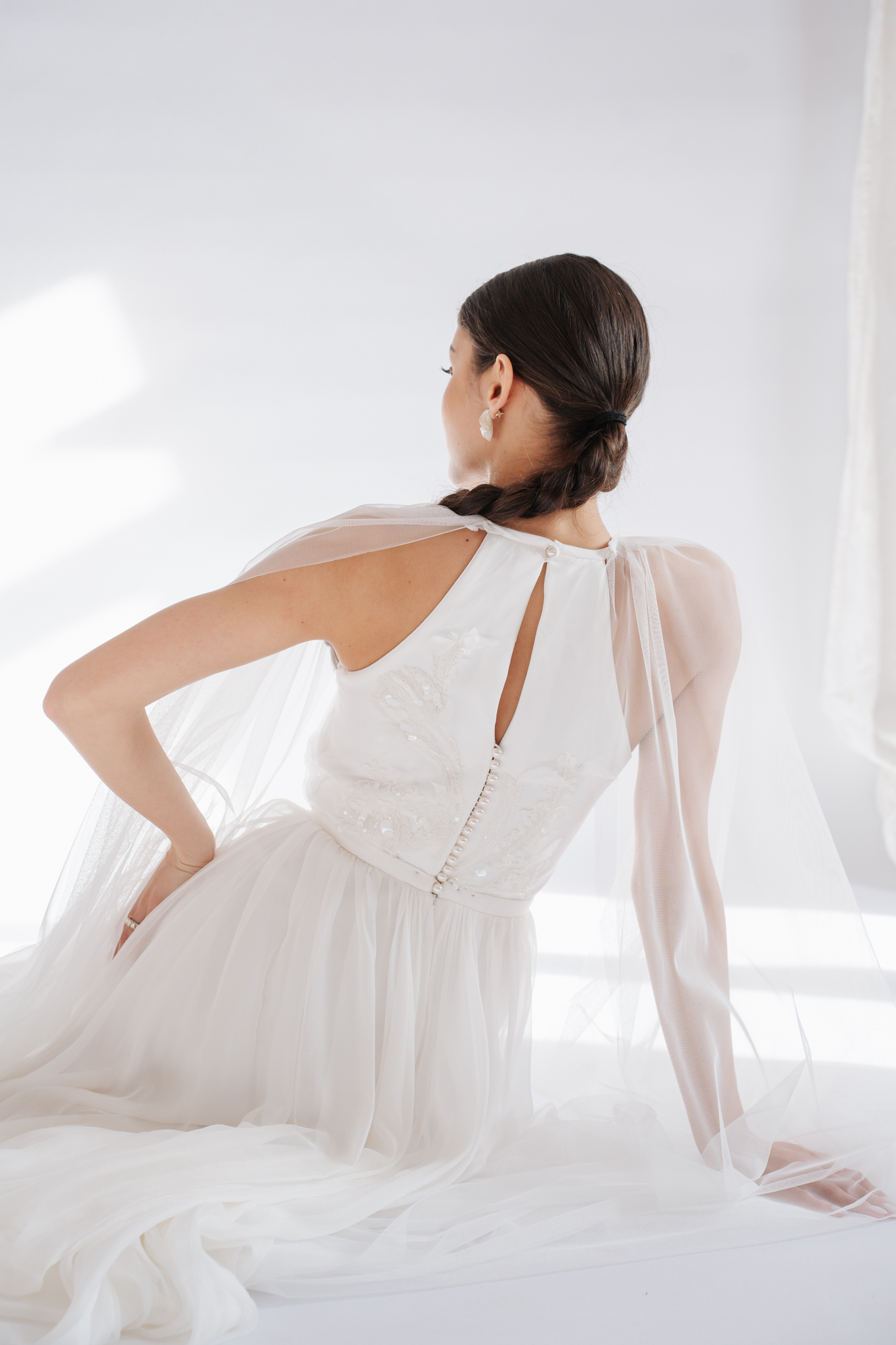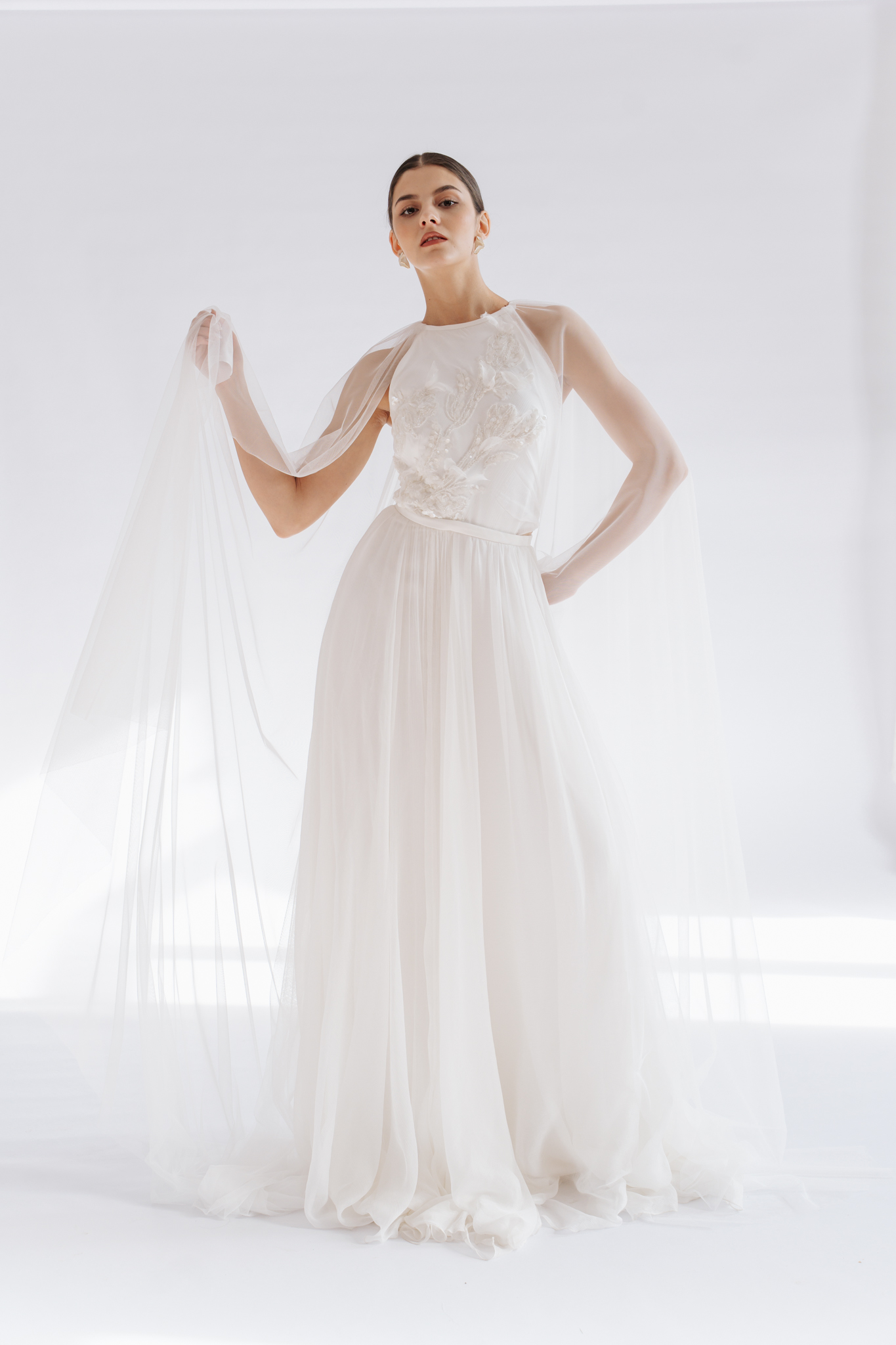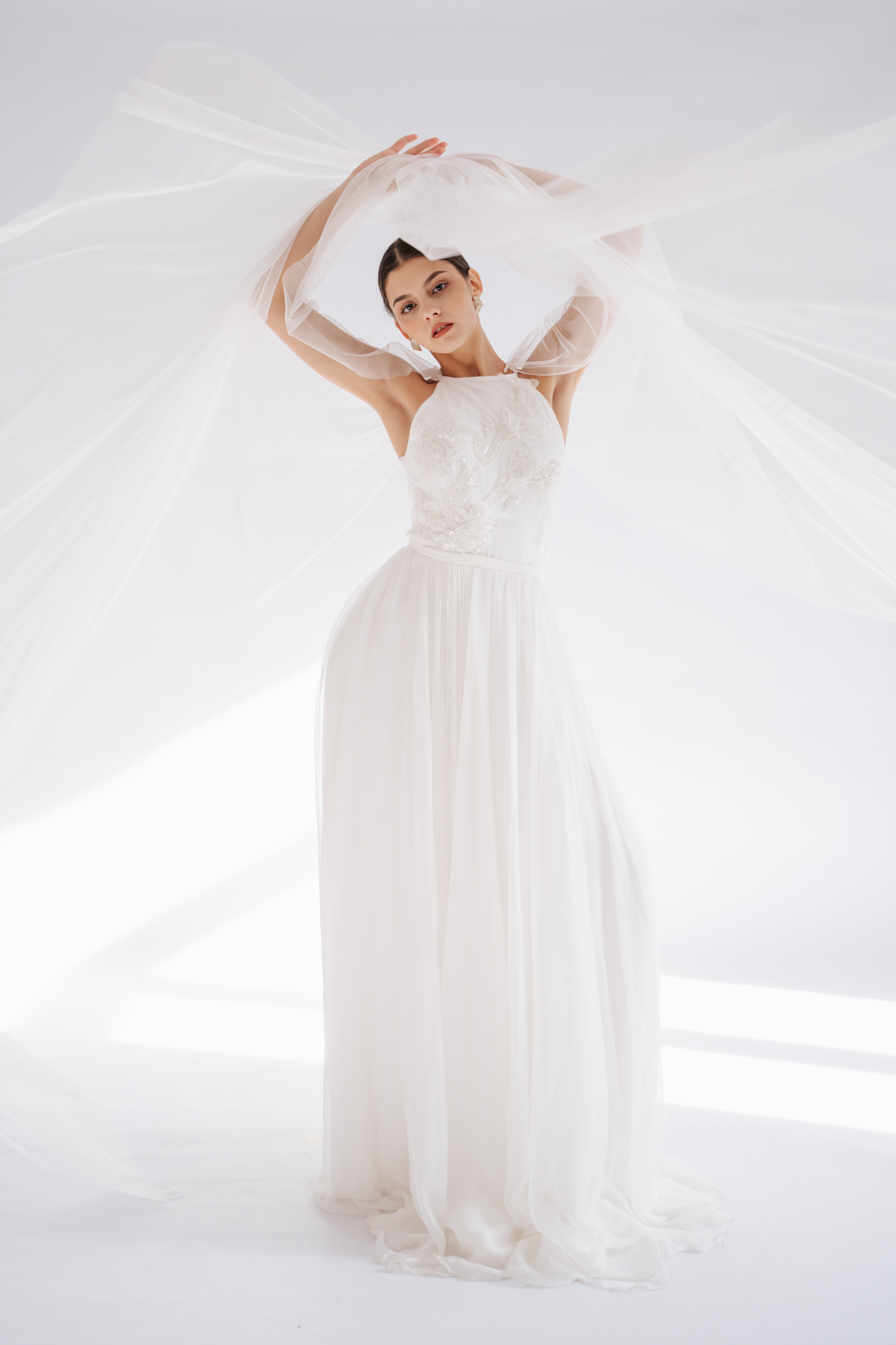 Softness and fluidity define every detail of the Lisette gown. The delicate drape of the natural silk muslin skirt is beautifully complemented by airy shoulder veils. The halter neckline features hand-embroidered details, highlighted by shimmering beads and sequins.