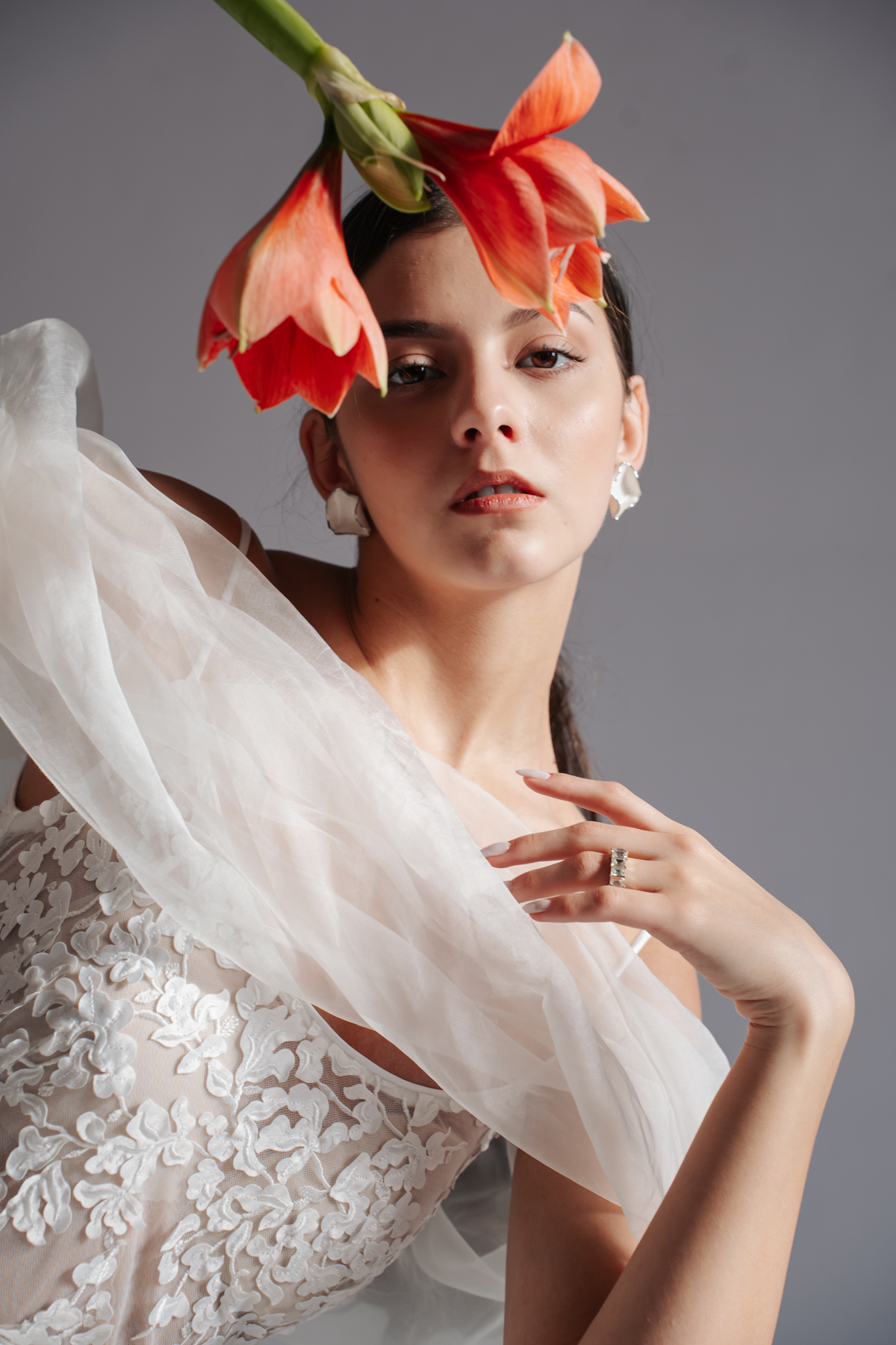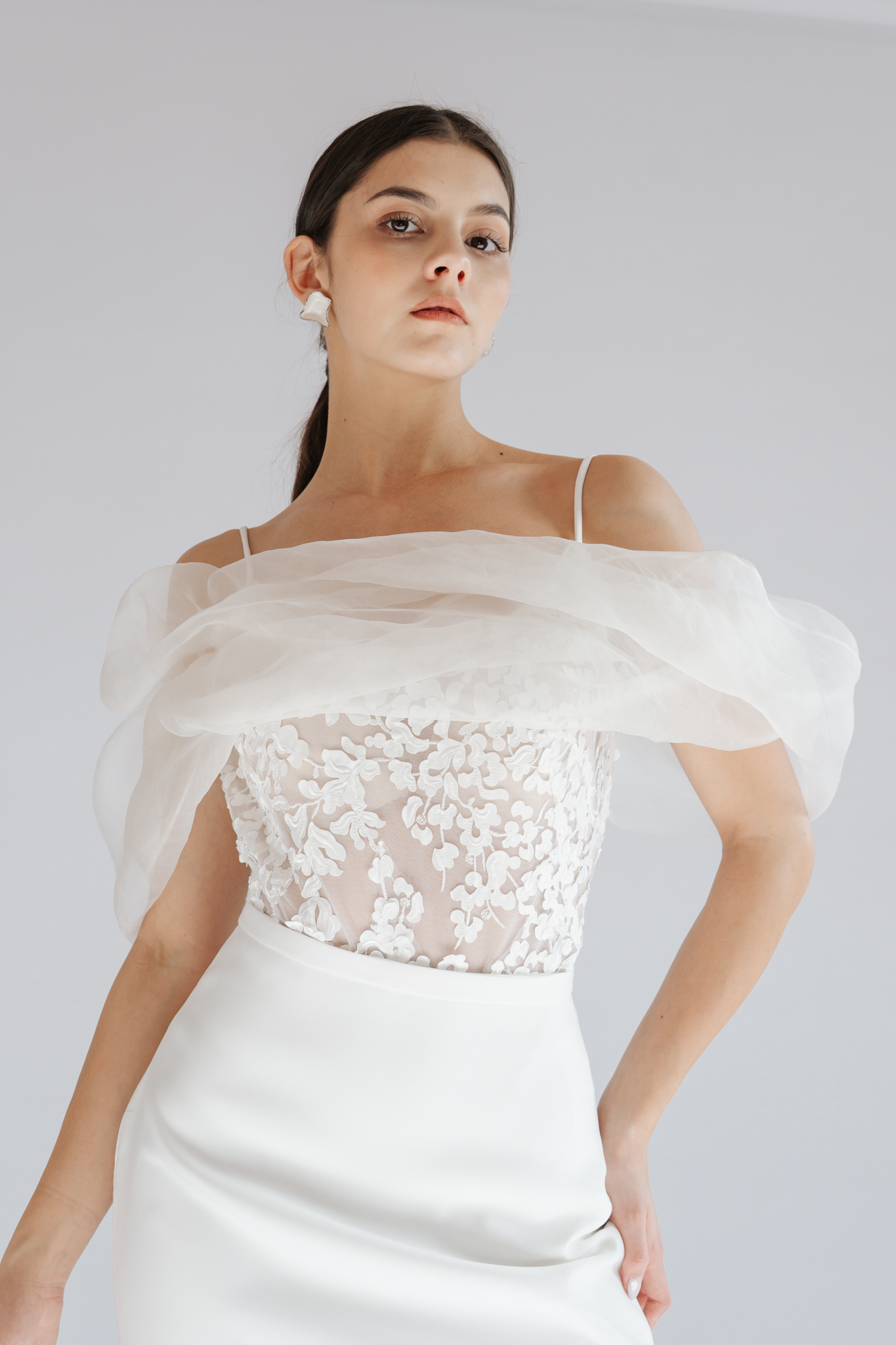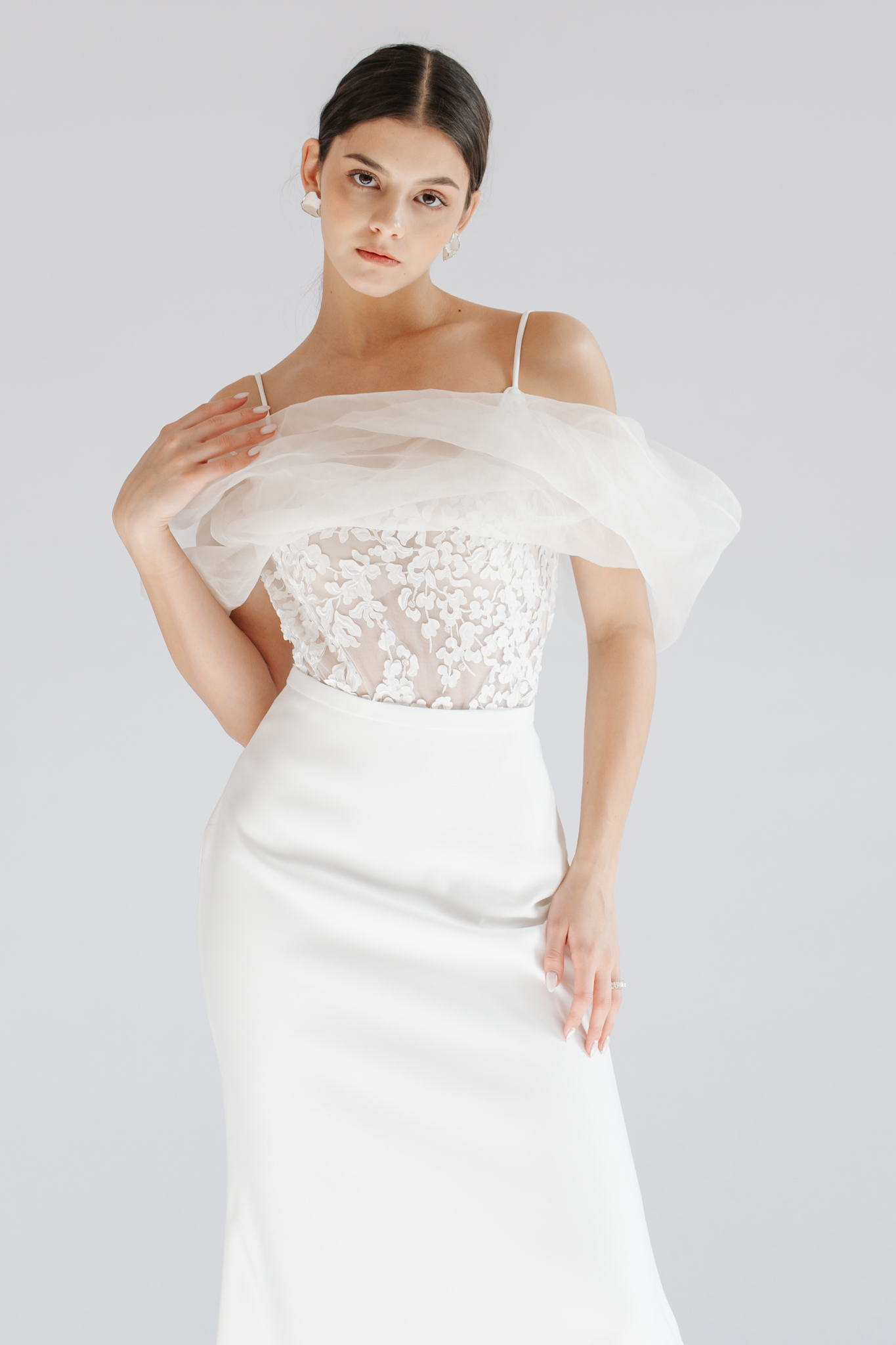 A modern minimalizmust absztrakt mintájú csipkével ötvözi a Liviah ruha. Hozzá természetes selyem organza vállrészt álmodtunk, mely a spagetti pántos összeállítást elegánsabbá varázsolja.