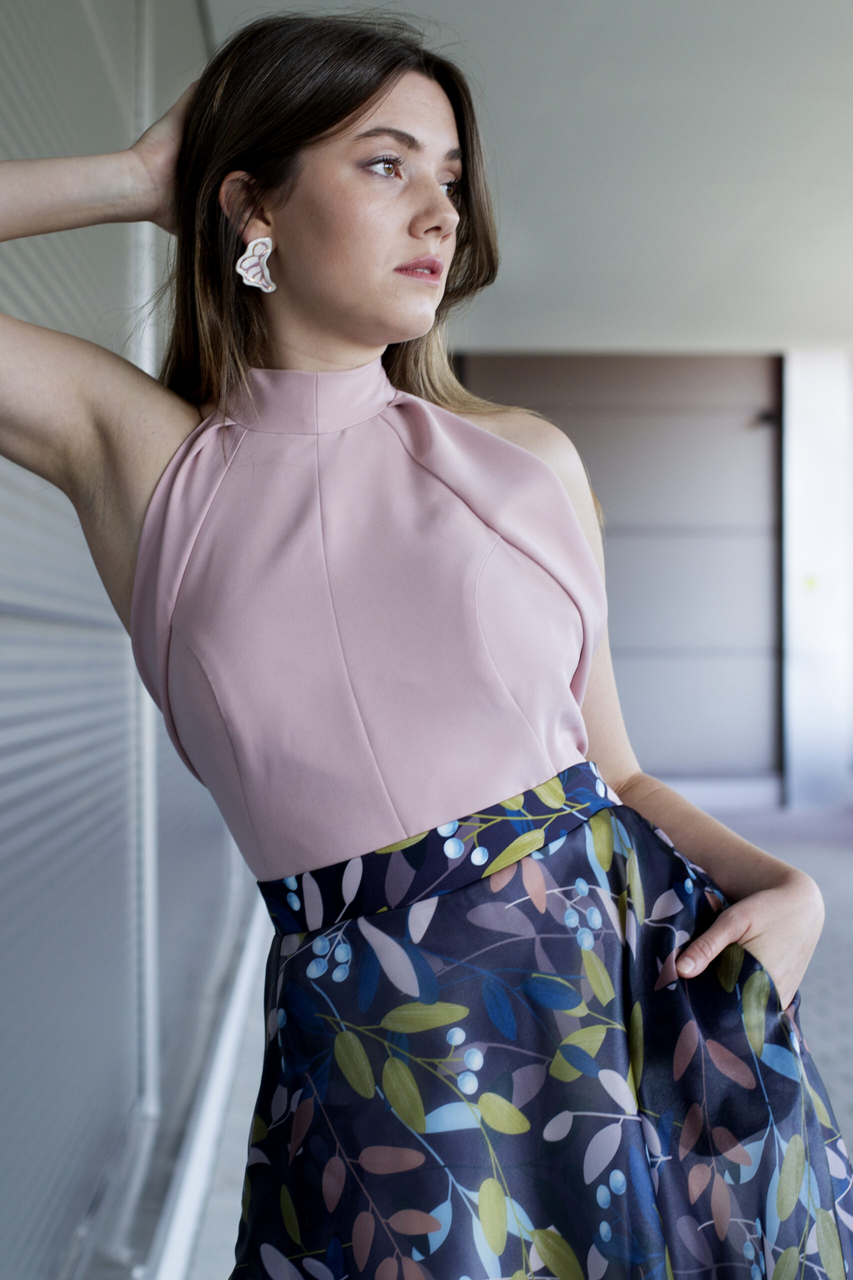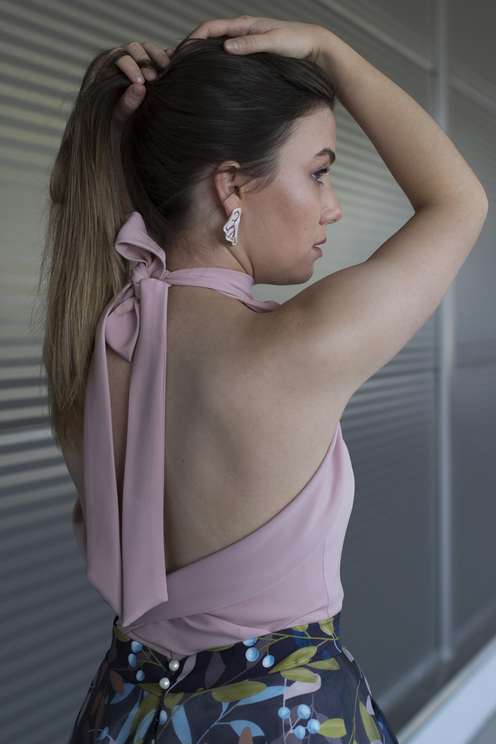 Ez a letisztult szabású, nyakbakötős pasztel rózsaszín felsőrész modern eleganciát sugároz. Egyszerűségnek és lazaságának köszönhetően tökéletes választás különleges alkalmakra vagy stílusos hétköznapokra.
