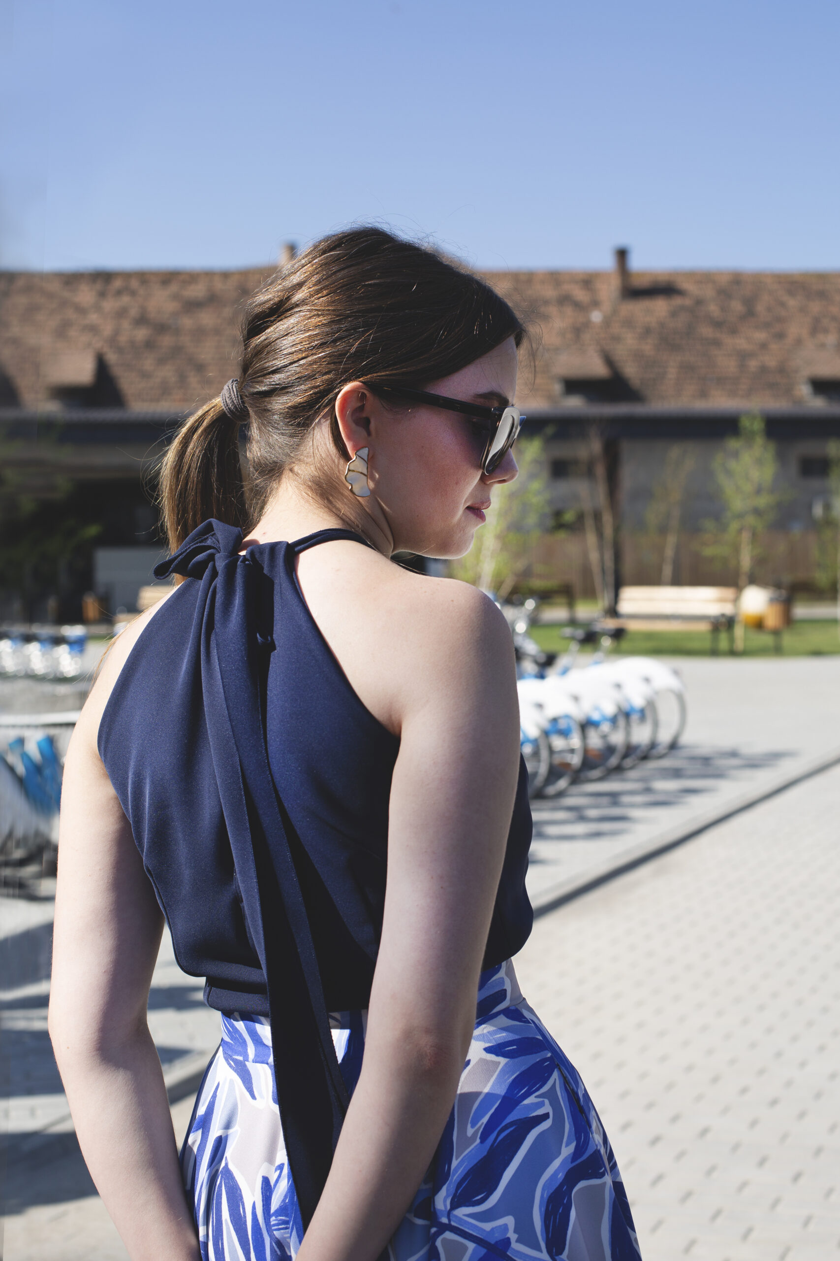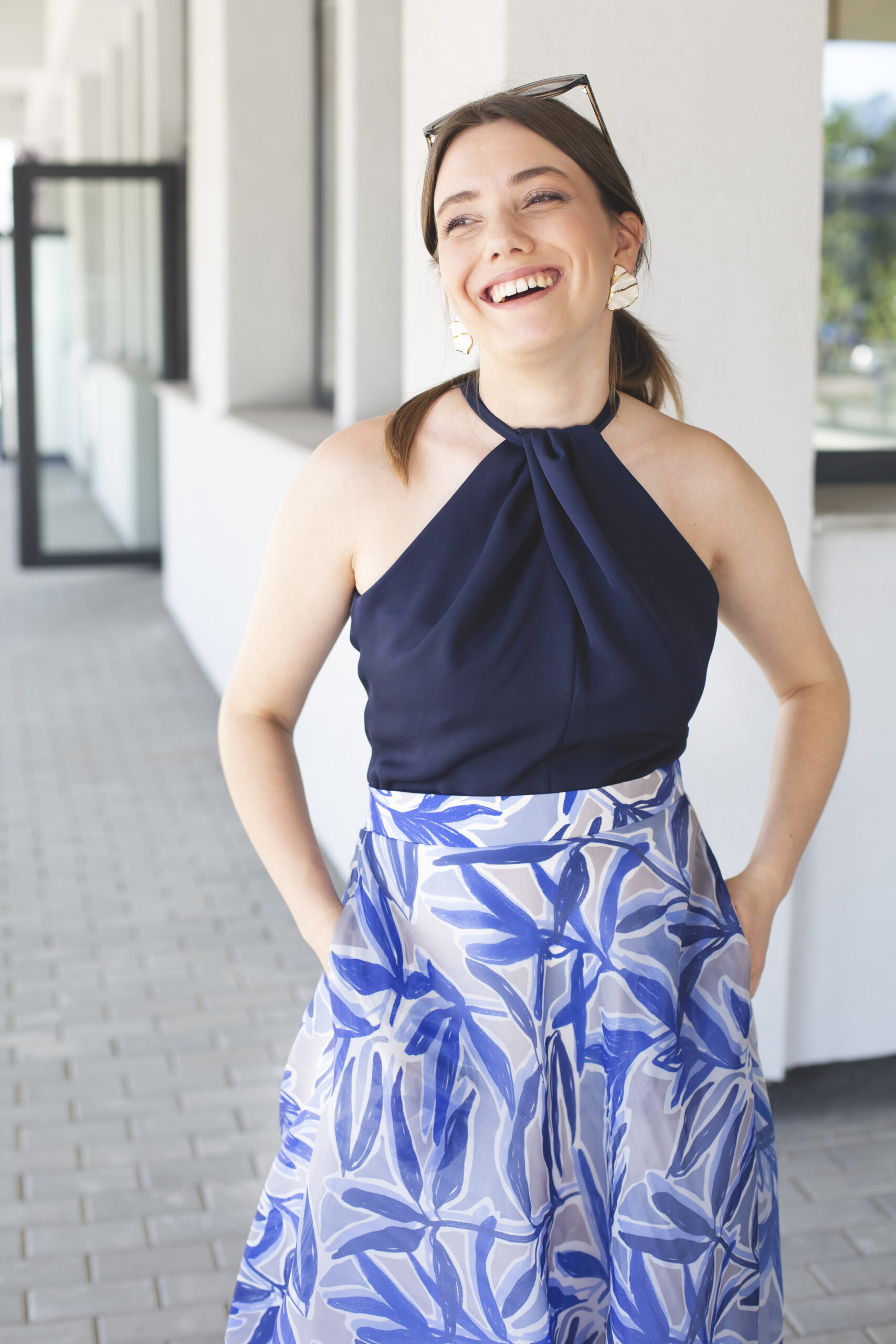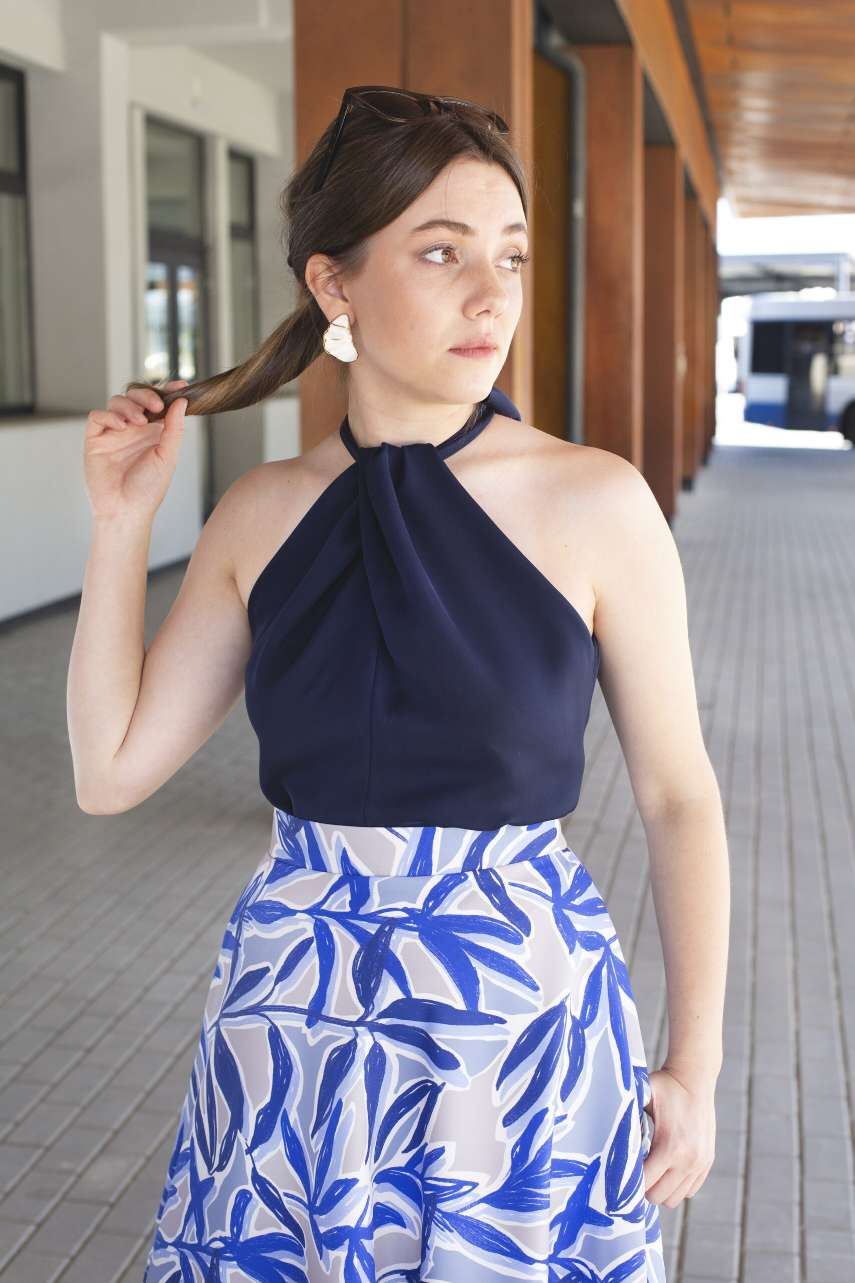 Ez a letisztult szabású, sötétkék felsőrész modern eleganciát sugároz. Egyszerűségnek és lazaságának köszönhetően tökéletes választás különleges alkalmakra vagy stílusos hétköznapokra.