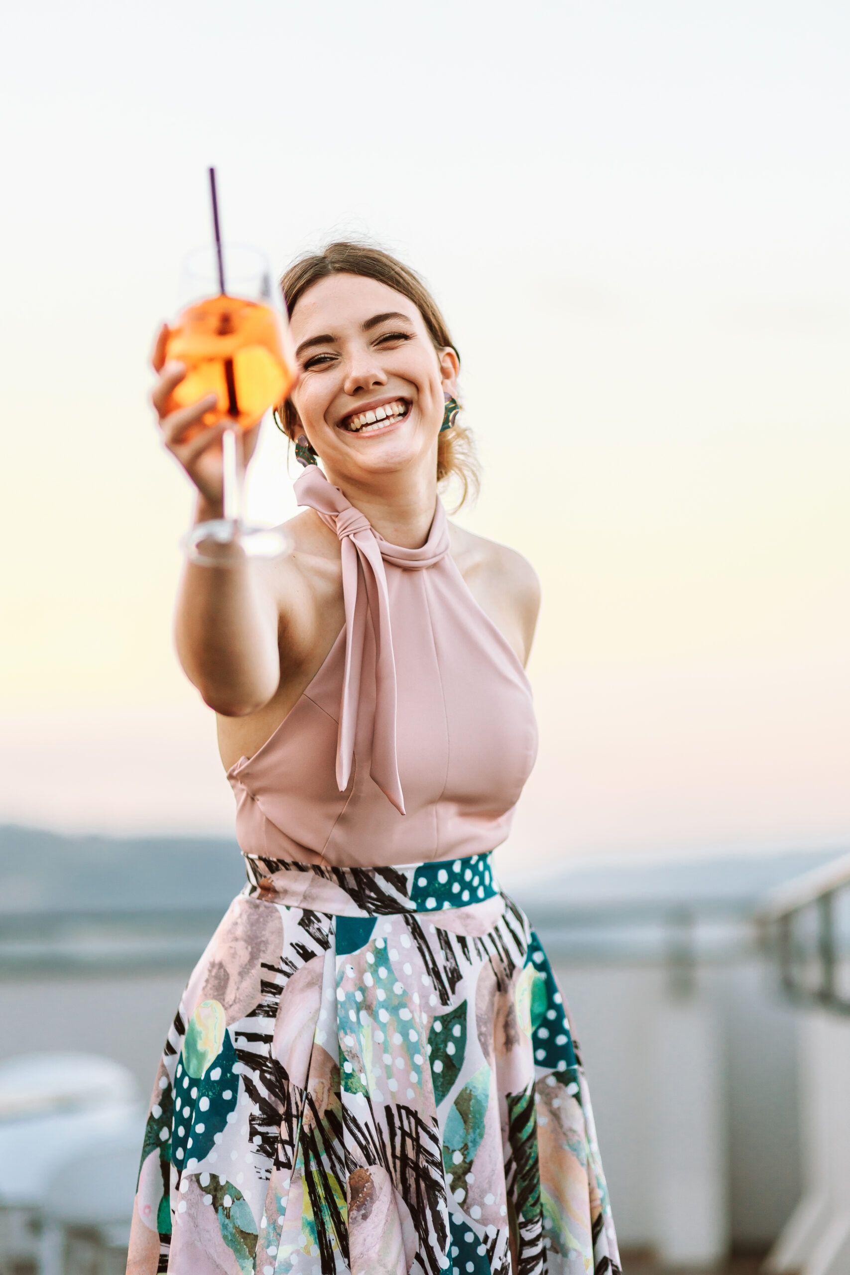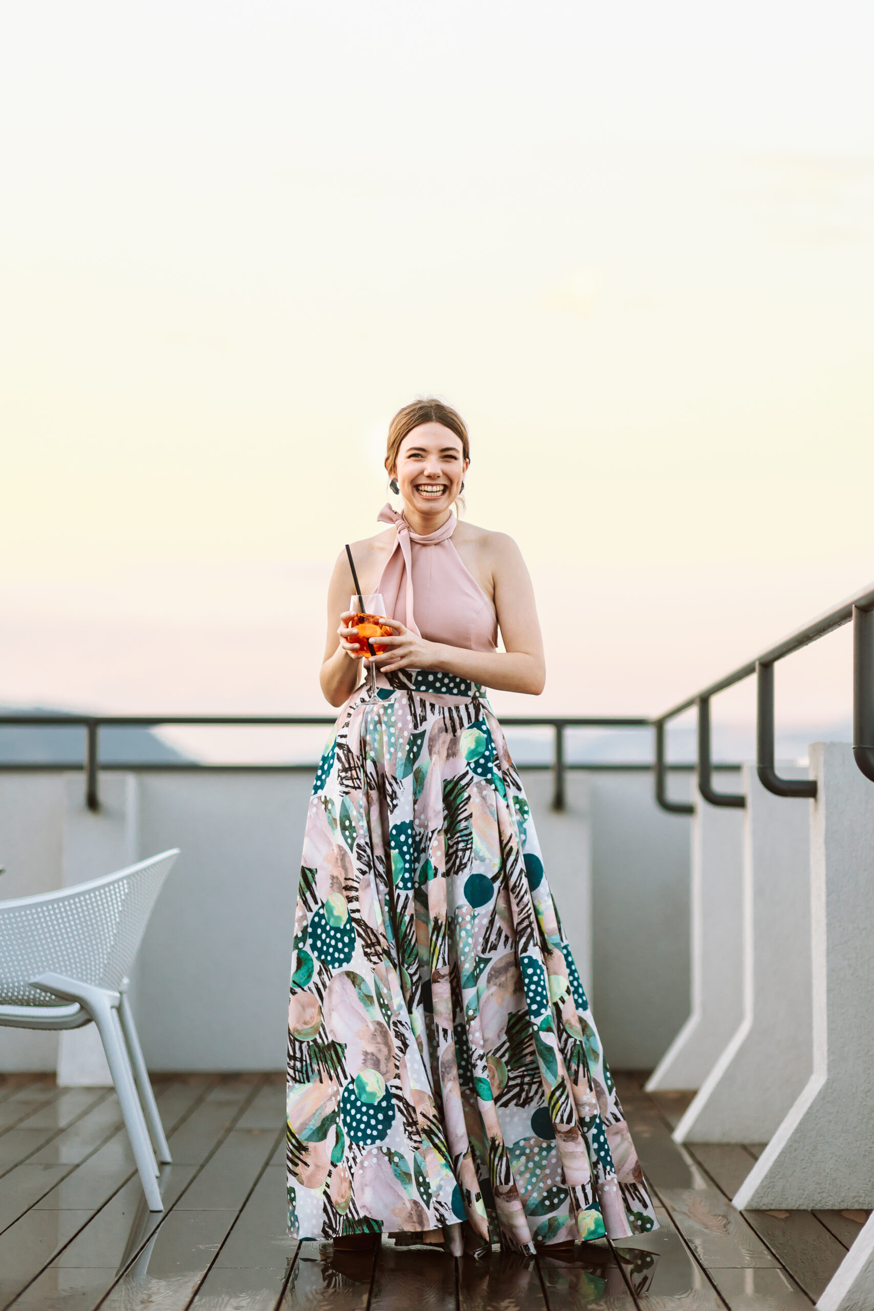 Lazán simul a csípőre ez a félkörből kivágott, kreppzsorzsett anyagból készült színes, hosszú szoknya. A festői minta teszi igazán különlegessé ezt a darabot. A hatalmas egyedi tervezésű mintáknak és a lágy árnyalatoknak köszönhetően az összhatás feltűnő, de nem hivalkodó.