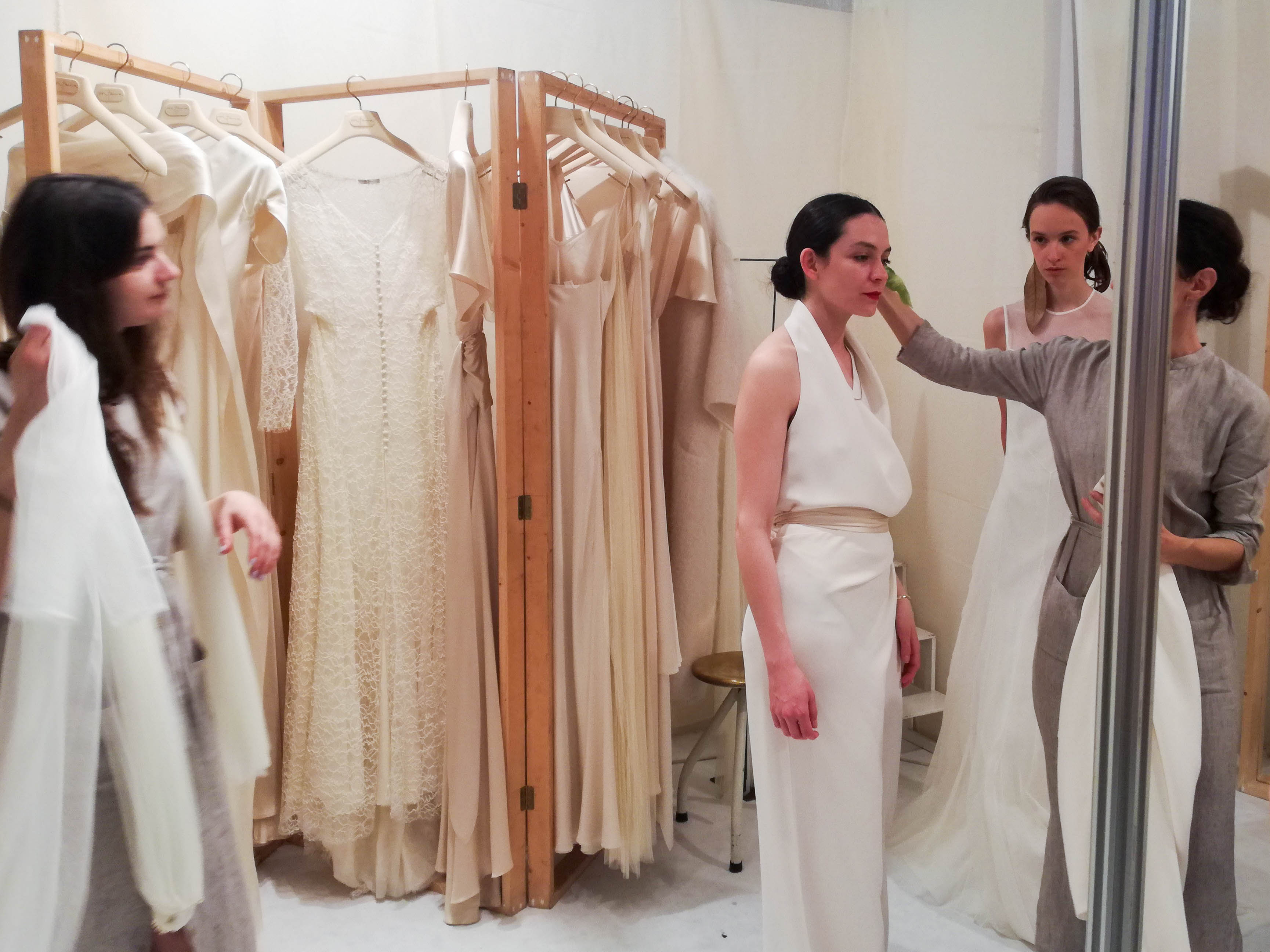 Totuși, ceea ce am căutat noi cu adevărat au fost brandurile mai mici, asemănătoare cu noi, cu un public țintă mai restrâns. Și ne-am bucurat să aflăm că într-adevăr există un segment al pieței, unde aspectele primordiale sunt unicitatea, naturalețea, stilul degajat și rafinat. Brandul de care ne-a plăcut cel mai mult a fost Cortana din Spania. Deja showroomul lor a fost o minune, plină de culori calde, materii fine și naturale, croieli degajate. Totul a fost demn de toată laudă. Designerul brandului se numește Rosa Esteva, ea a crescut într-un sat spaniol, pe insula Mallorca, și a beneficiat încă din copilărie de o relație intimă cu natură, iar acest fapt se vede instant la rochiile concepute de către ea. Materialele folosite la rochiile de mireasă Cortana sunt fine și boeme, materialele lor de bază fiind, în general, muselina, mătasea din satin, organza și dantelele de mătase. Un alt favorit al nostru a fost brandul Sophie et Voilà, tot din Spania. Trăsăturile lor principale sunt liniile minimaliste, dar elegante, respectiv accesoriile îndrăznețe. Sofía Arribas, fondatorul și designerul și-a început cariera cu crearea, la comandă, a pălăriilor unicate, iar după un timp ea a început să facă și rochii. Acest brand se ocupă nu numai cu rochii de mireasă, ci și cu tot feluri de ținute pentru evenimente speciale. Ne-au mai fost simpatici și brandurile Colour Nude din Spania, respectiv Kisui din Berlin.